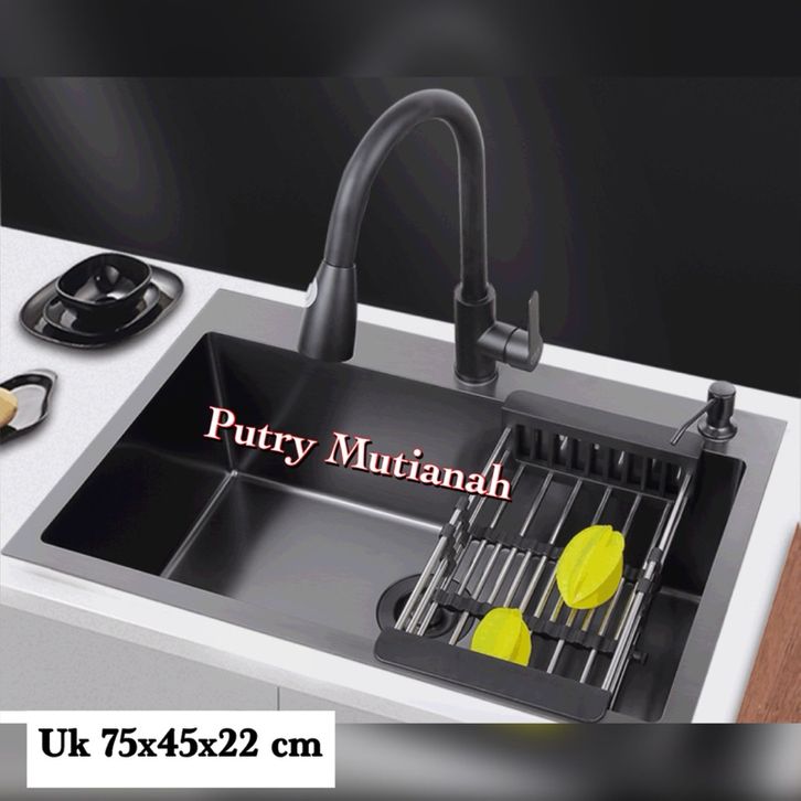 PROMO Paket Komplit Kitchen Sink modern BLACK 75x45cm stainless sus 304 wastafel cuci piring set Kran