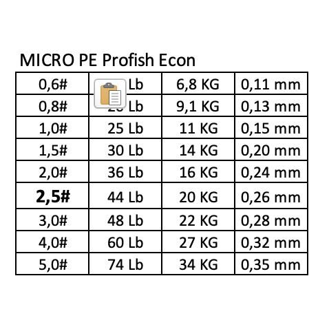PE 0.6, PE 0.8, PE 1.0, PE 1.5, PE 2.0, PE 2.5, PE 3.0, PE 4.0, PE 5.0