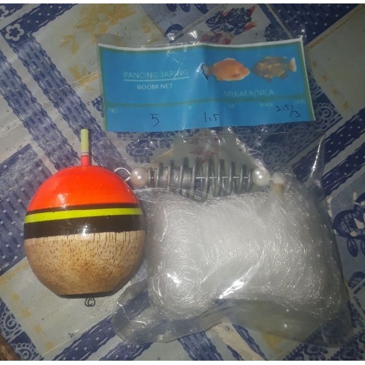 pancing jaring boom net tinggi 1,5meter + pelampung kayu bulat senar 015mm