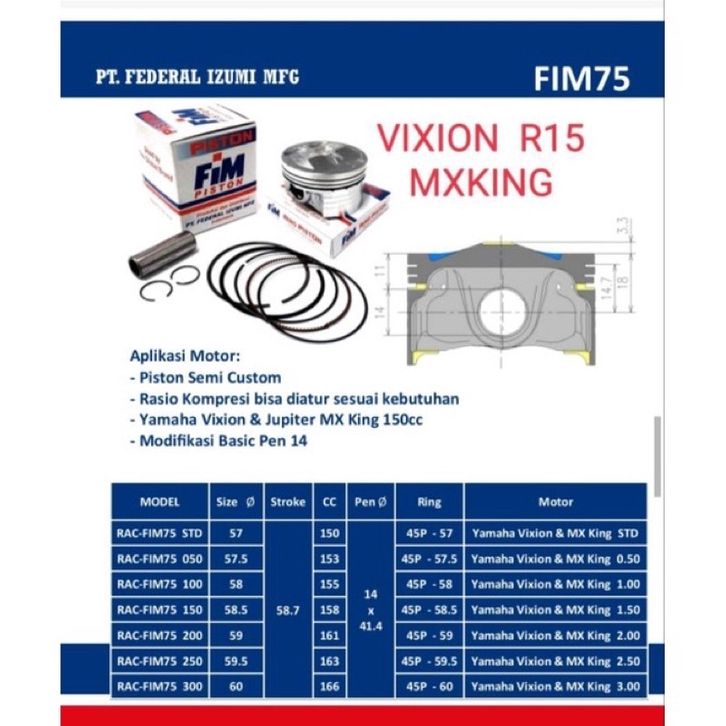 PISTON FIM AH1 VIXION R15 JUPITER MX KING 150 JUPITER MX 135 XABRE MT15 VIXION R Ukuran 57 57.5 58