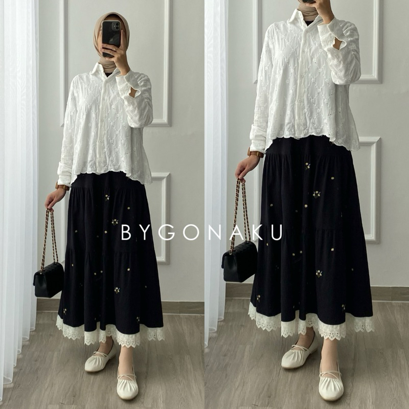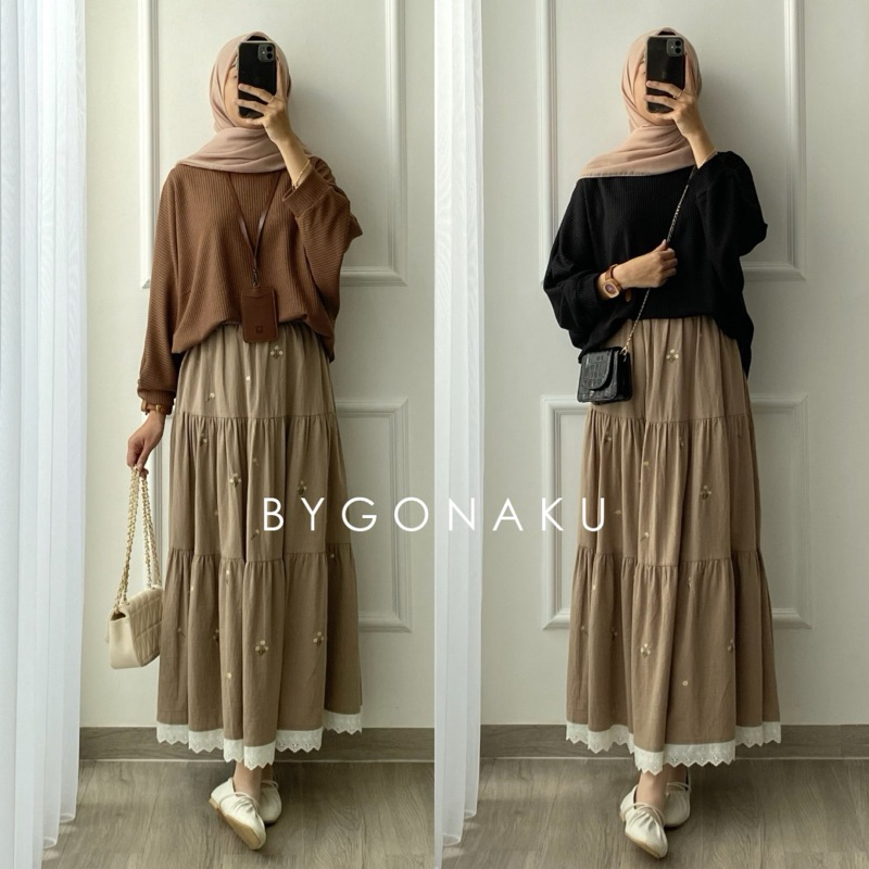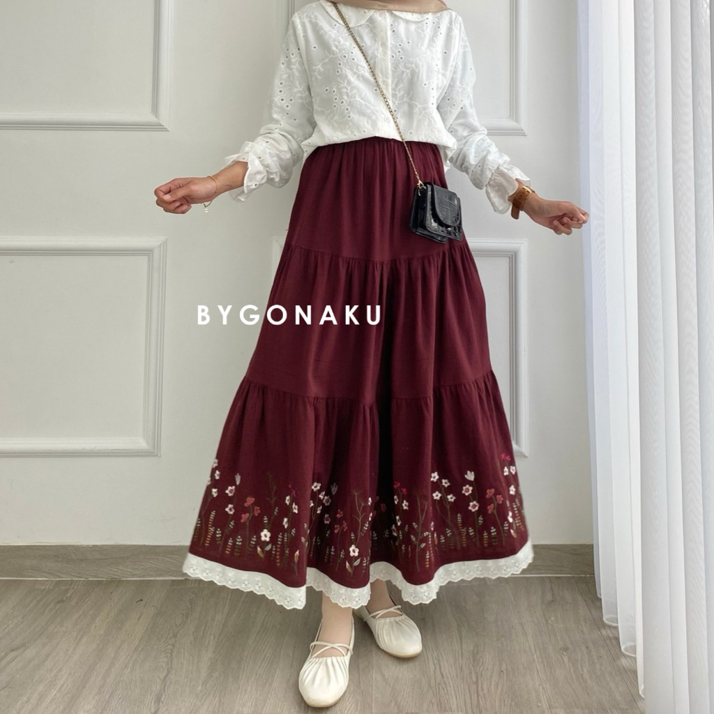 Dhara Skirt Embroidery Linen | Rok Panjang Linen Bordir | Highwaist Skirt | Korean Style | Rok Wanita Panjang Polos | Fl