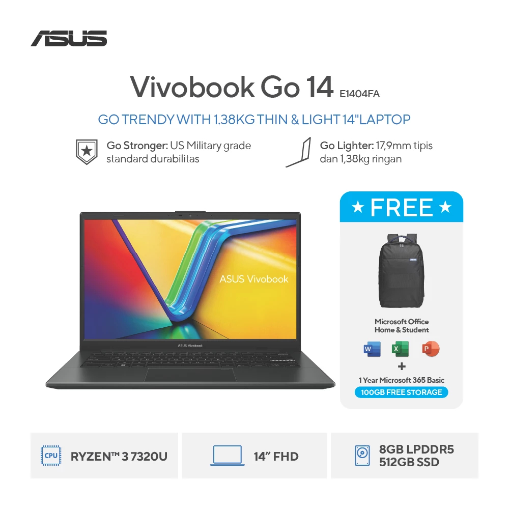 [Mall] LAPTOP ASUS VIVOBOOK GO 14 E1404FA RYZEN 3 7320U 8GB 256GB/512GB W11+OHS 14.0 FHD BLK