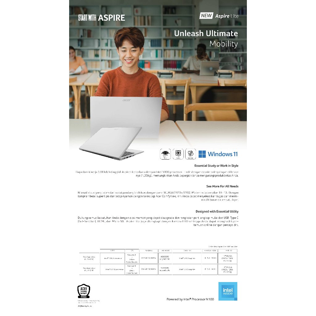 [Mall] (FREE WIRELESS MOUSE) ACER LAPTOP ASPIRE LITE AL14-31P-C3MH/AL14-31P-C0WW 14" WUXGA INTEL N100 RAM 8GB STORAGE 256GB SSD INTEL UHD GRAPHICS WINDOWS 11