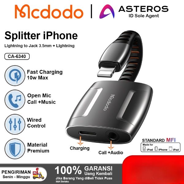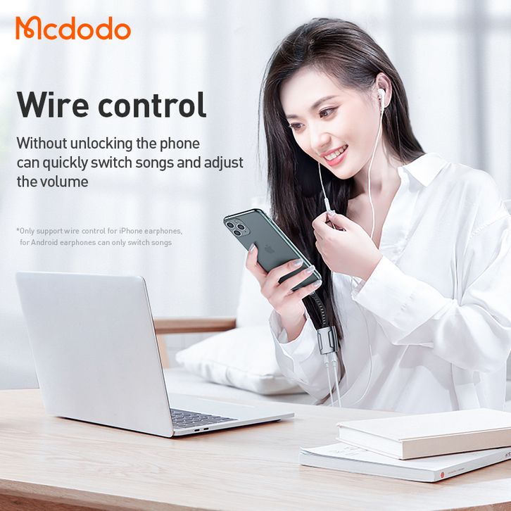 MCDODO Converter Splitter For iPhone Lightning Ke Jack 3.5mm + Lightning Charging Audio Call Open Mic CA-6340