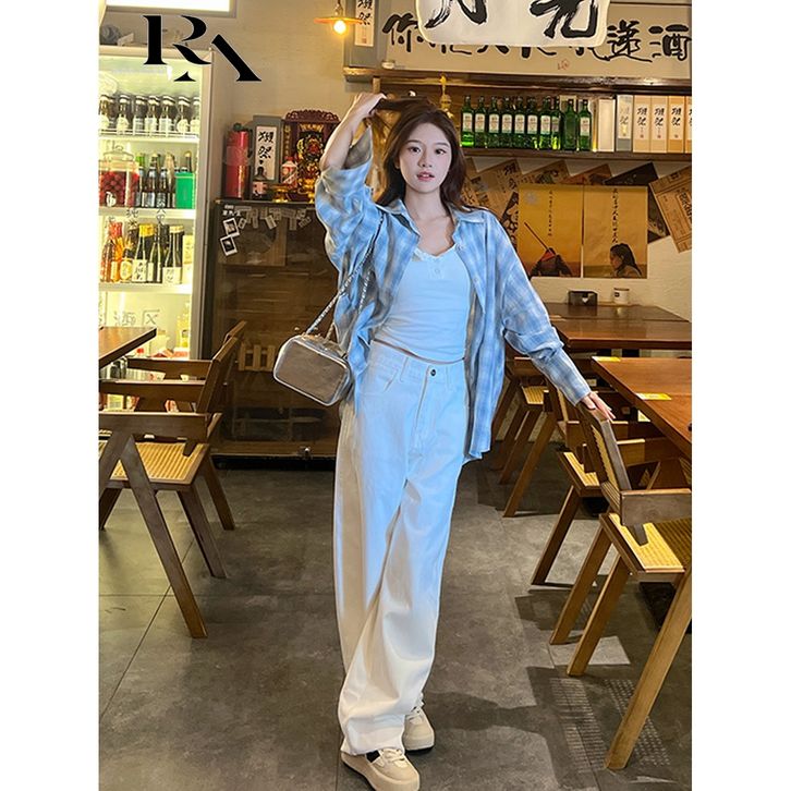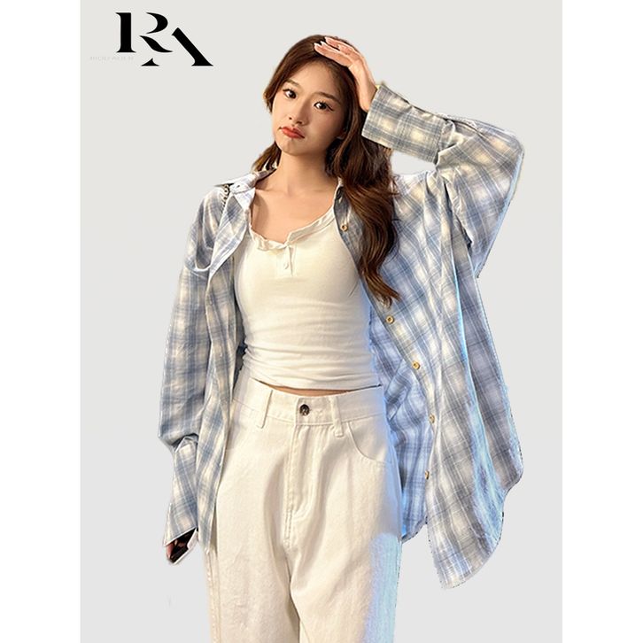 PROMO BLOUSE WANITA KEMEJA KOTAK-KOTAK BIRU WANITA LONGGAR KOREA BIRU DAN PUTIH LENGAN PANJANGV TERLARIS