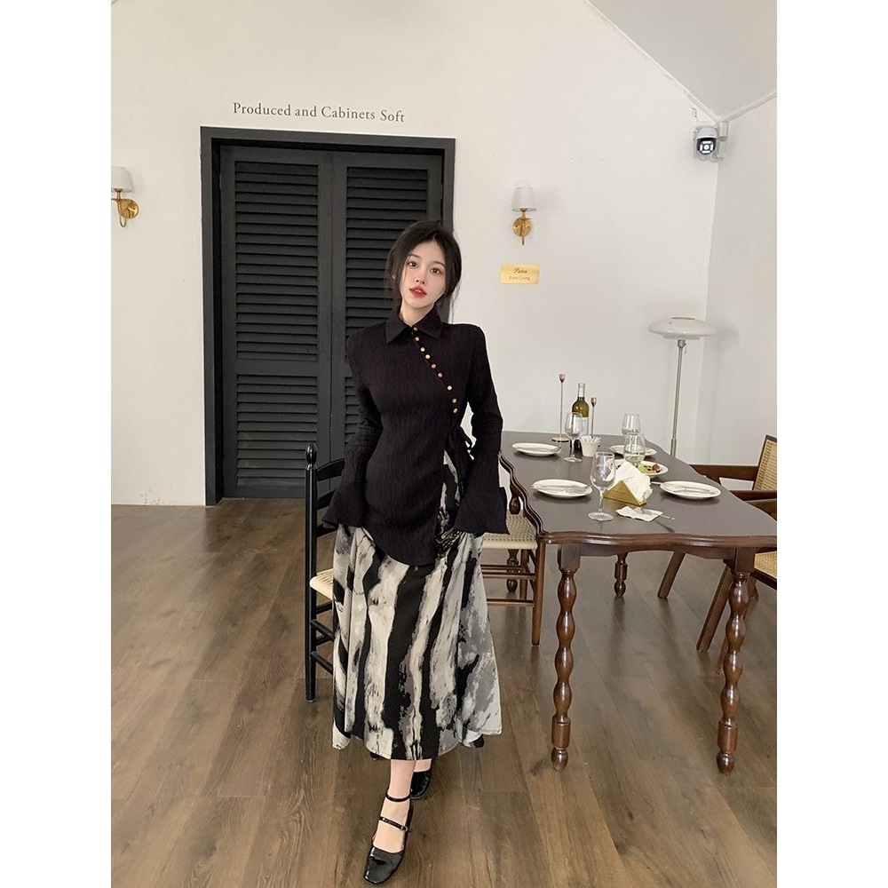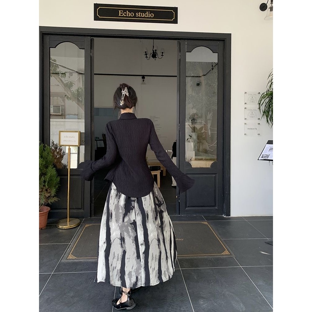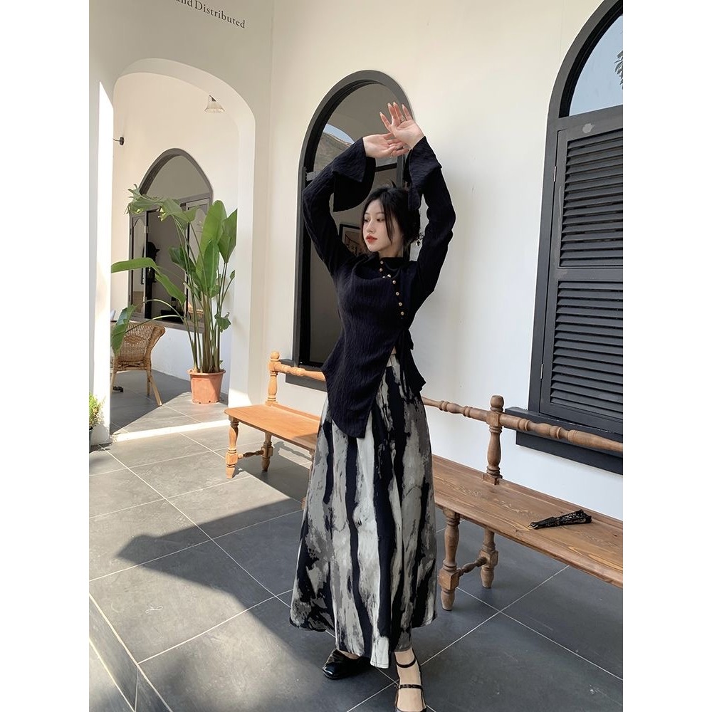 [Star] Terbaru One Set Wanita Kemeja Lengan Panjang Belahan Diagonal Gaya Cina Rok Cetak Tinta Gaya Cina/Kekinian!