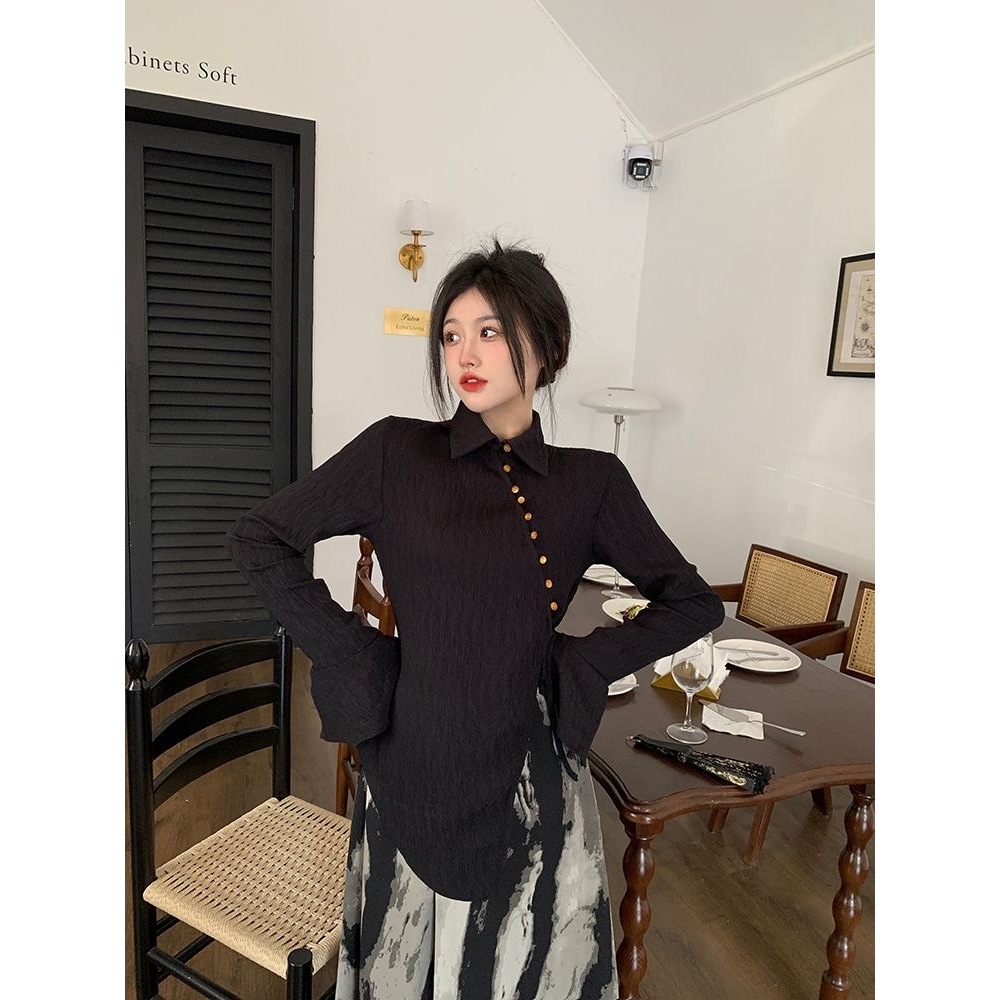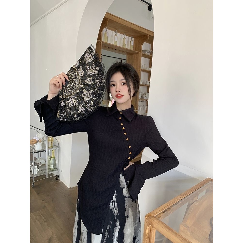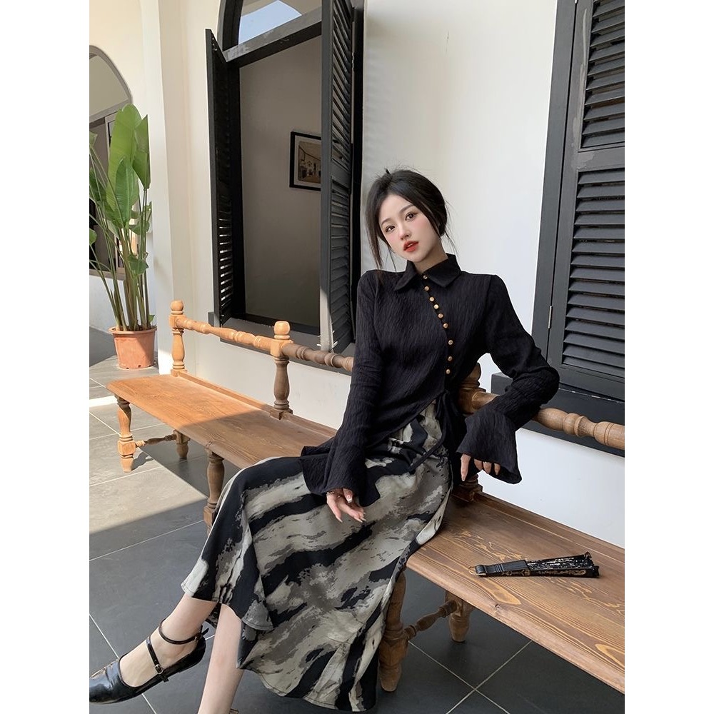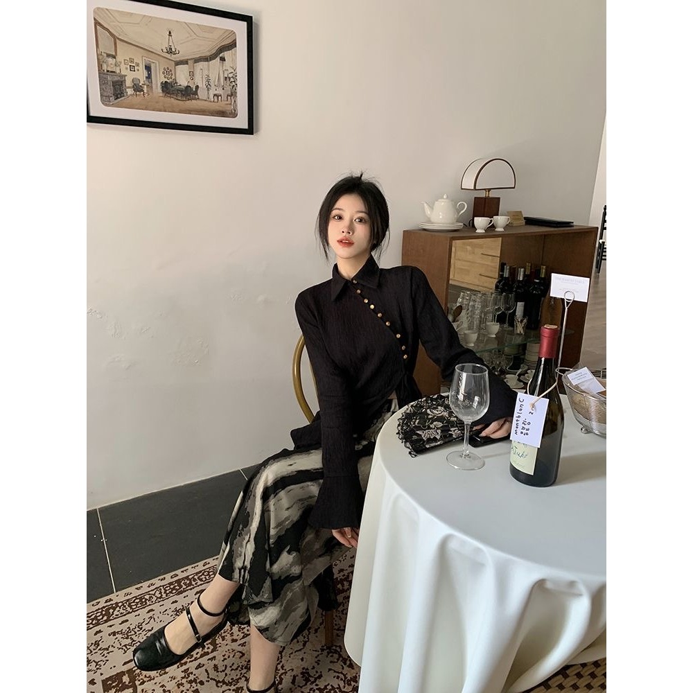 [Star] Terbaru One Set Wanita Kemeja Lengan Panjang Belahan Diagonal Gaya Cina Rok Cetak Tinta Gaya Cina/Kekinian!