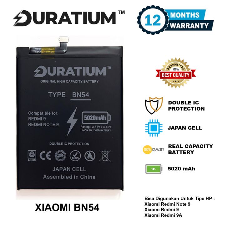 DURATIUM ORIGINAL Baterai Xiaomi Redmi Note 9 / Redmi 9 BN54 BN 54 5020 mAh Real Capacity 100 Batre Batrai Battery HP
