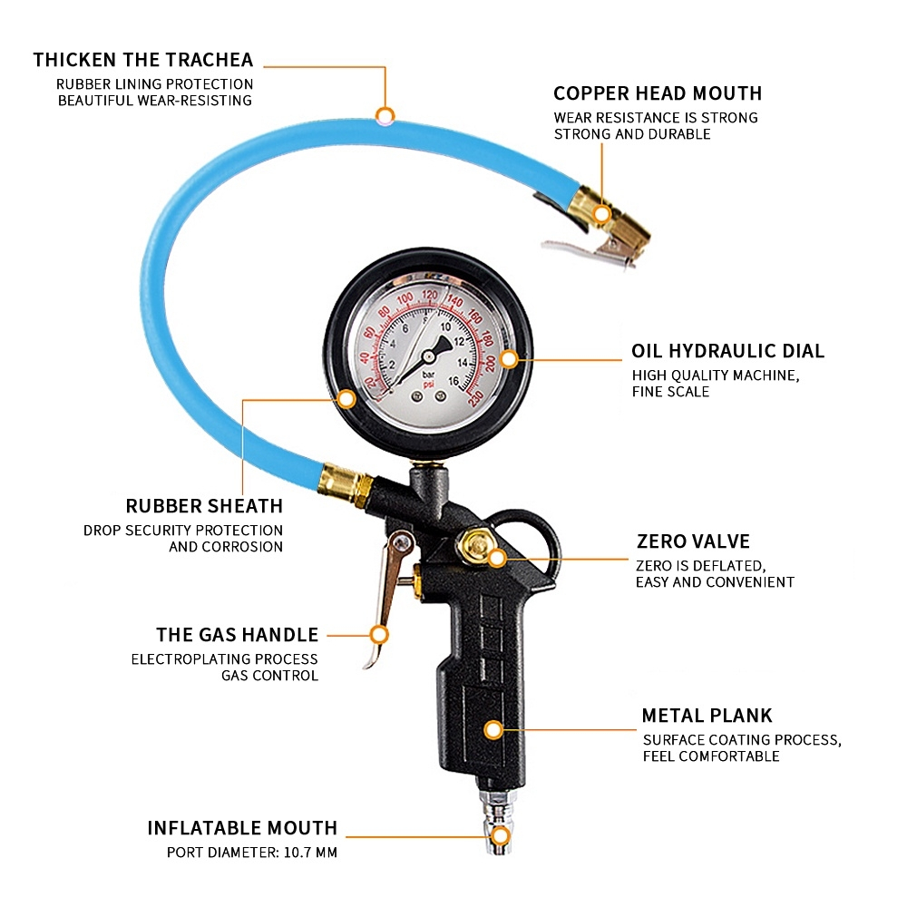 JLD OIL-FILLED TIRE INFLATOR AIR PRESSURE GAUGE ISI UKUR TEKANAN ANGIN 230PSI 3 IN 1 SELANG KOMPRESOR LISTRIK CAT BAN