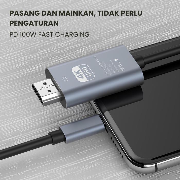 UPLU Adapter Kabel Type C to HDMI 4K UHD Converter Hp ke TV PD 100W Fast Charging - Grey 2 Meter