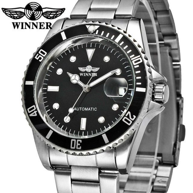 Jam Tangan Pria Mekanik Automatic Winner Submariner Silver Black Original