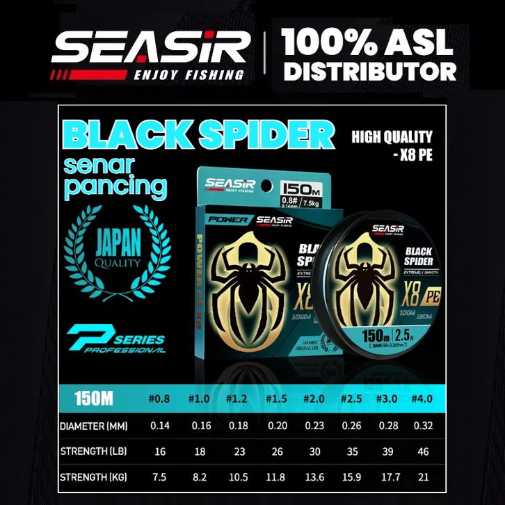 PROMO SEASIR BLACK SPIDER PE X8 SENAR PANCING (150 METER), P-SERIES PE BRAIDED FISHING LINE ICE BLUE 8 STRANDS PE FISHIN