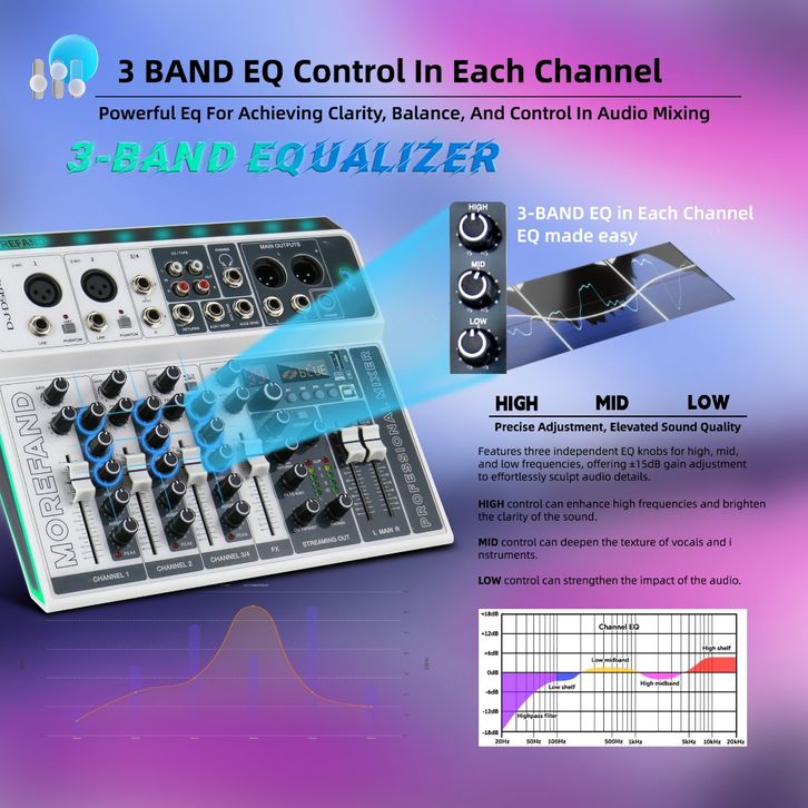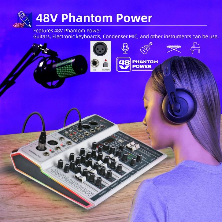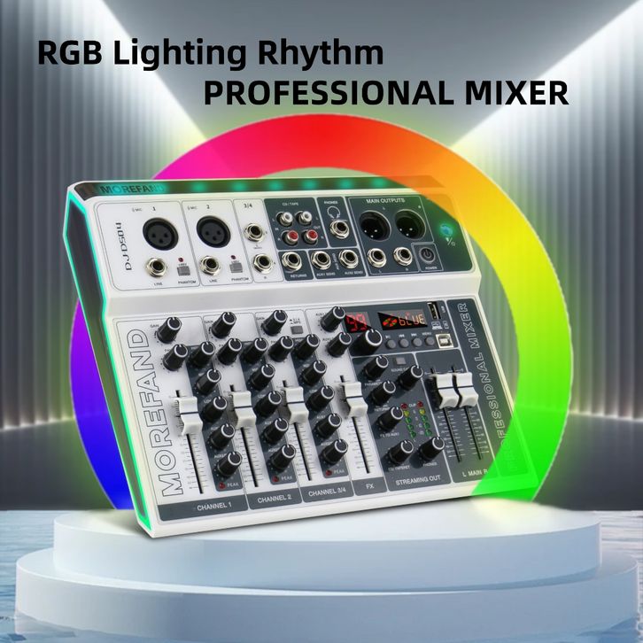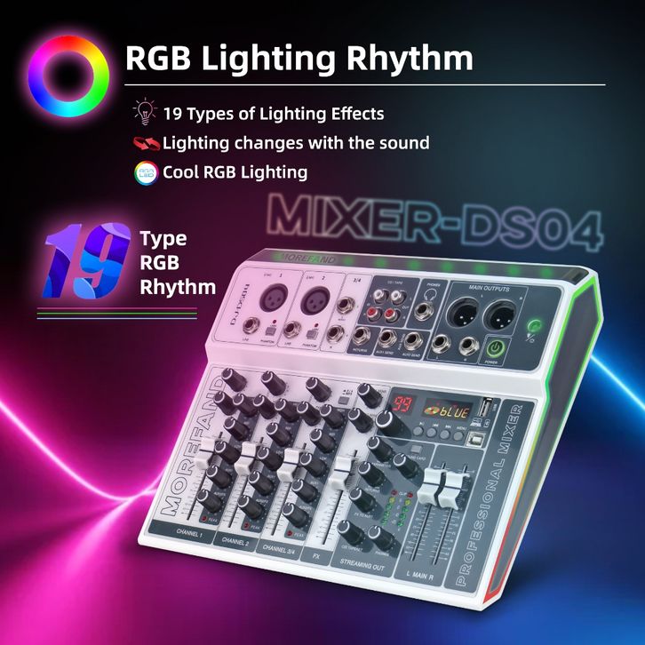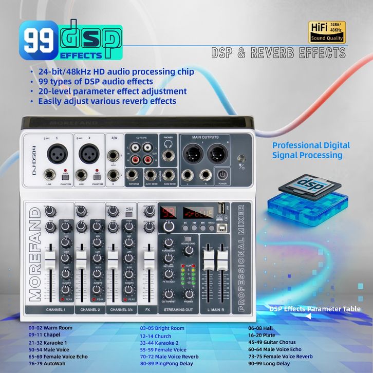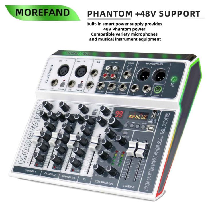 MOREFAND DJ-DS04 99DSP EQ mixer audio 12V 4 channel mendukung USB/Electro Bluetooth 48v Phantom power DJ Audio