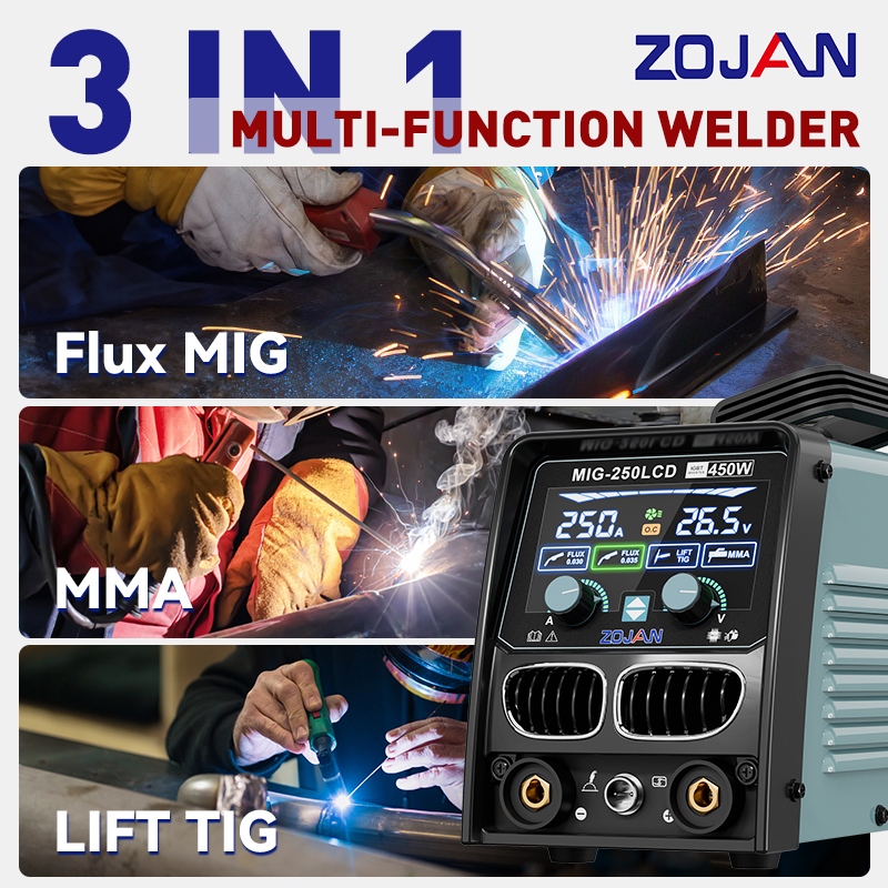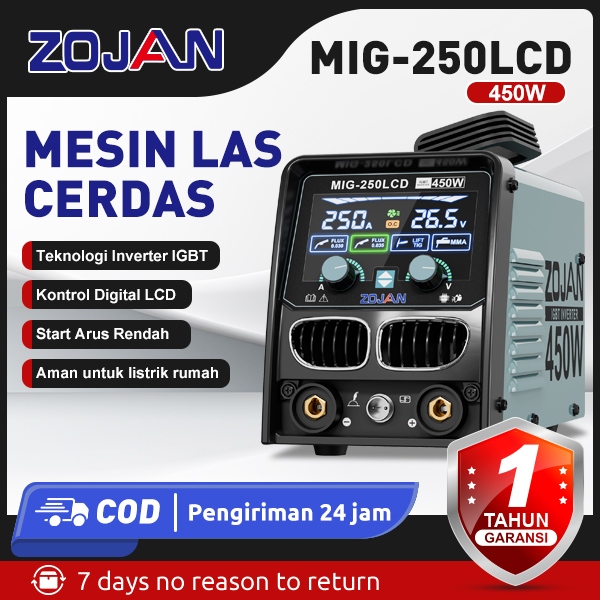 ZOJAN Mesin Las Cerdas Inverter IGBT MMA/MIG 3IN1 450W Power Welding Tools MIG-250LCD