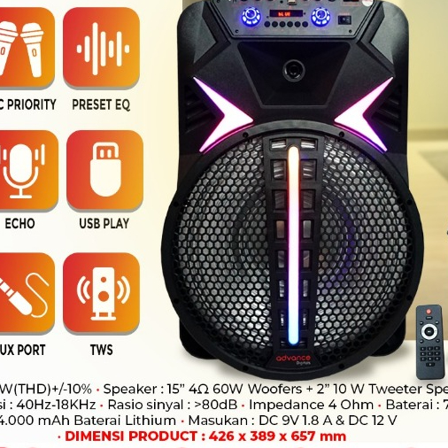 Advance K1509 Speaker Bluetooth Speaker15 inch Dual Microphone Wireless Garansi Resmi 1 Tahun