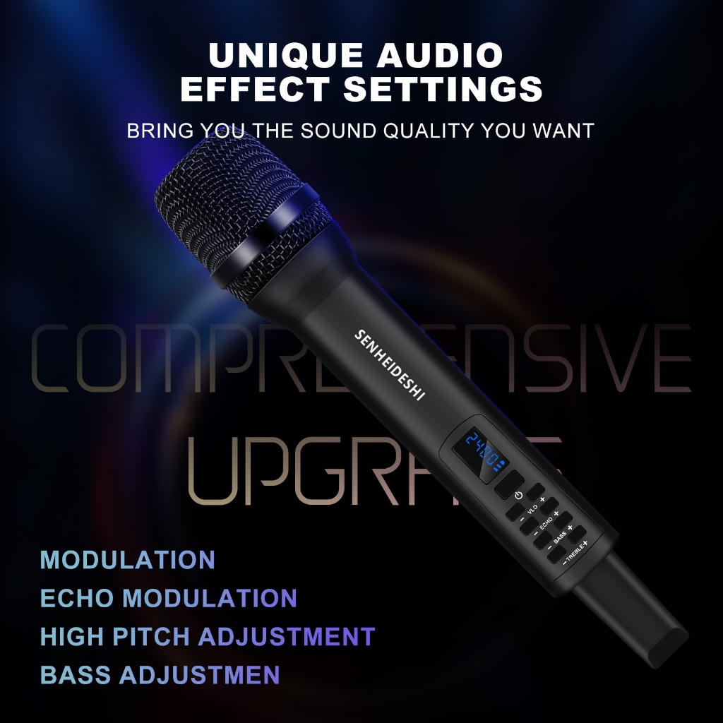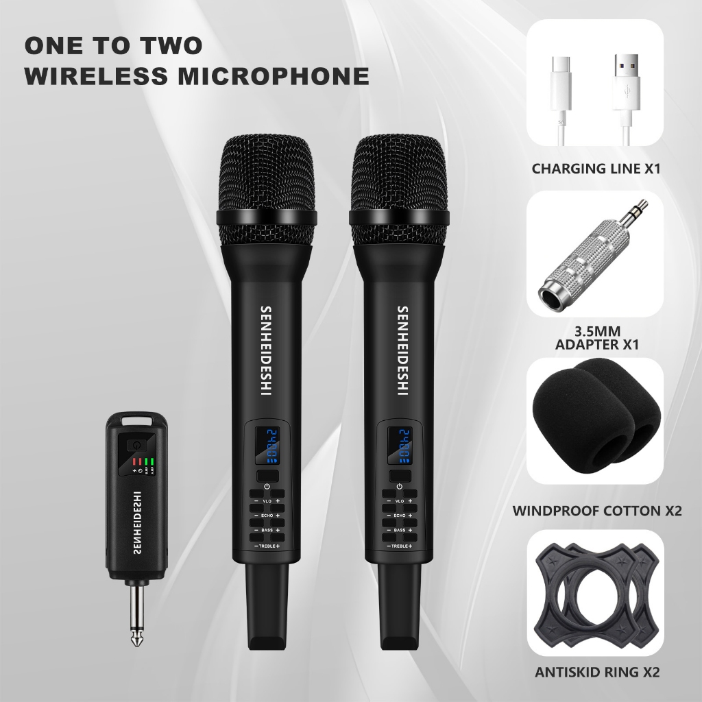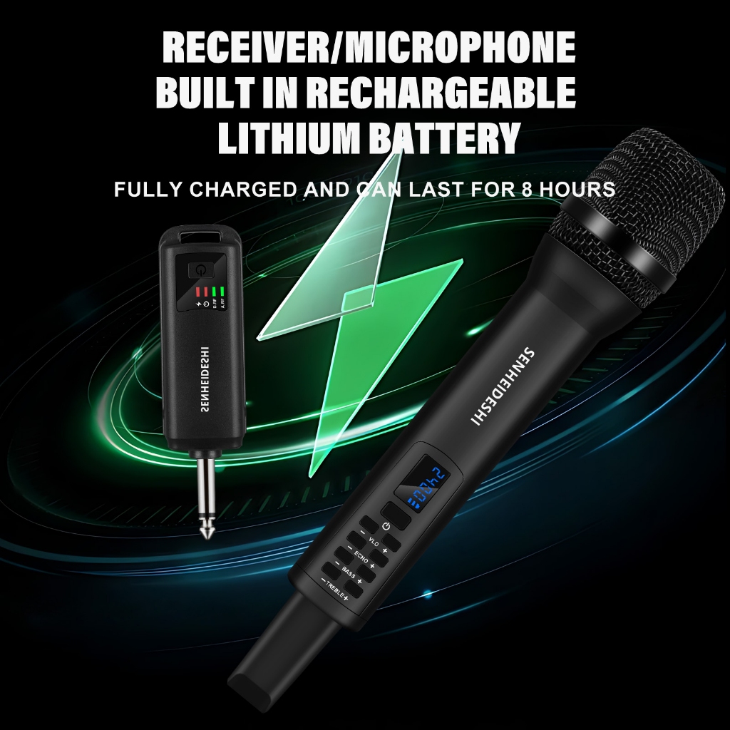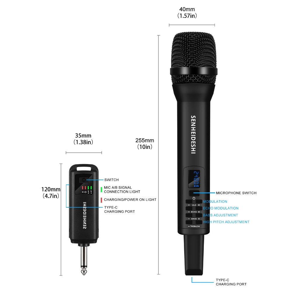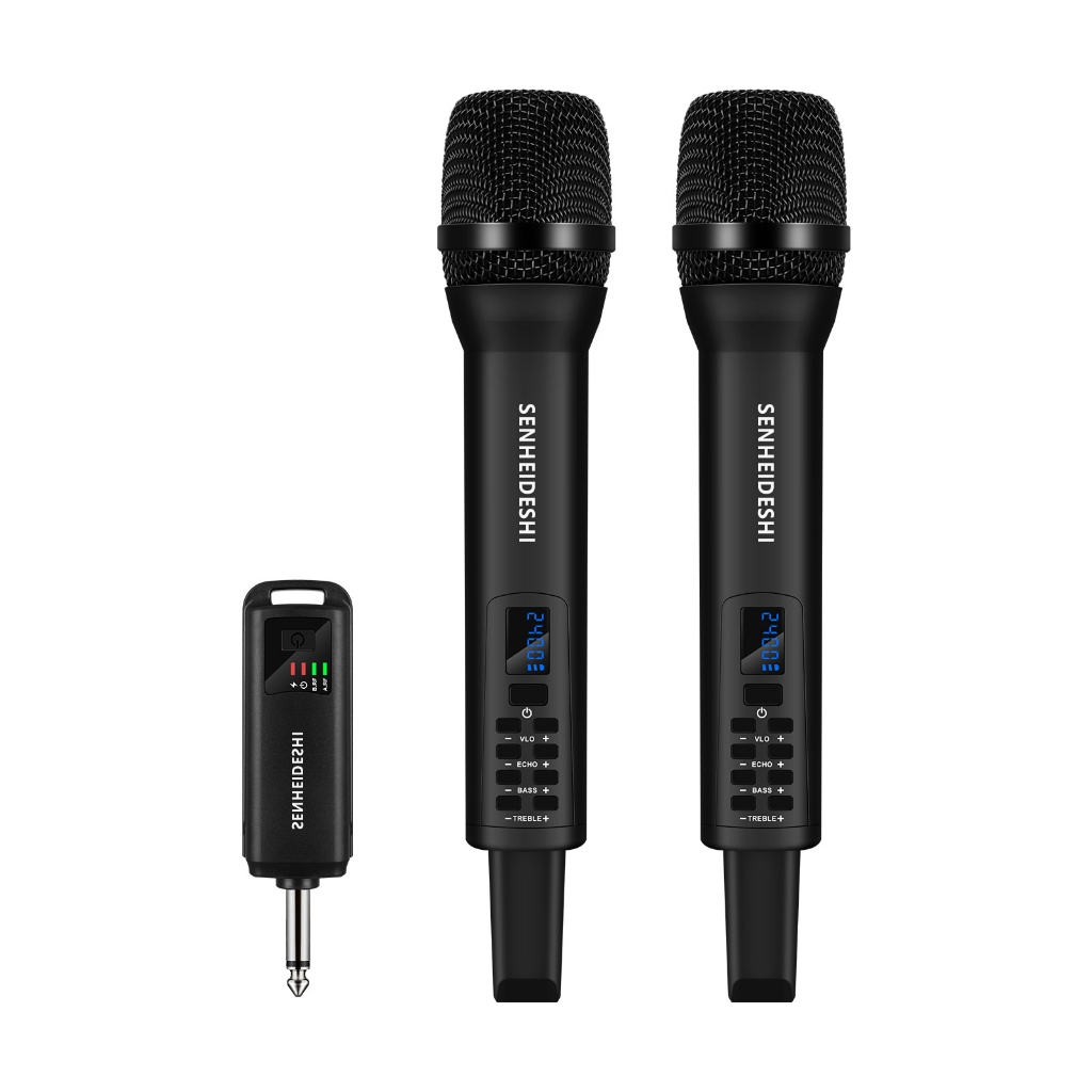 SENHEIDESHI N24-2 Mikrofon nirkabel penerima mic isi ulang 2.4g dengan penyesuaian volume/echo/treble/bass, jangkauan pe