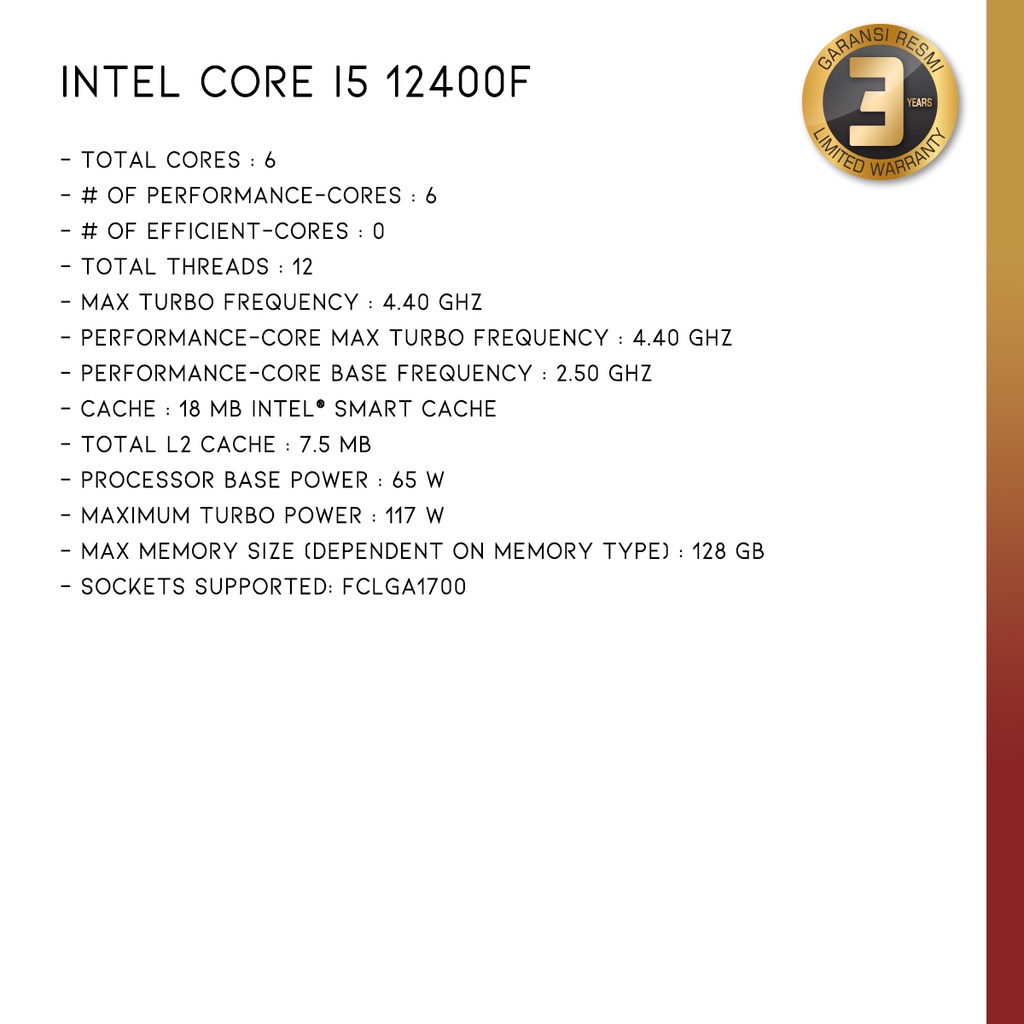 [Mall] INTEL CORE I5 12400F | DESKTOP PROCESSOR 6 (6P+0E) CORES LGA 1700