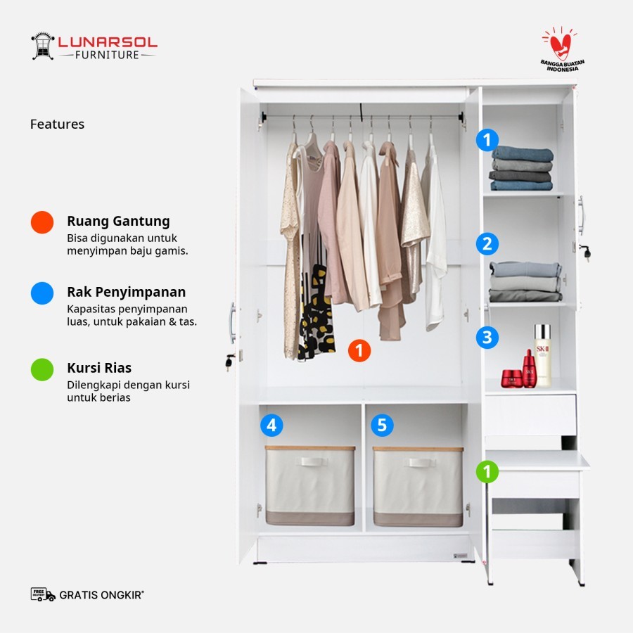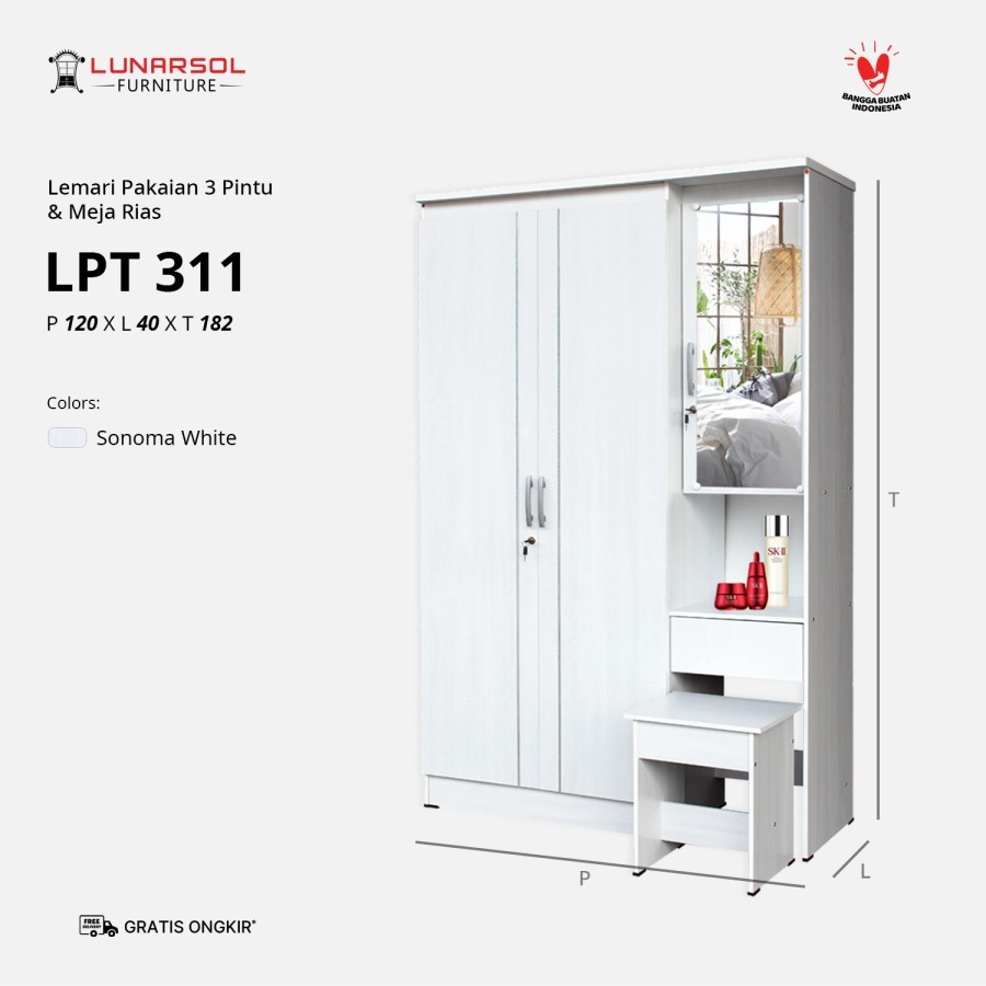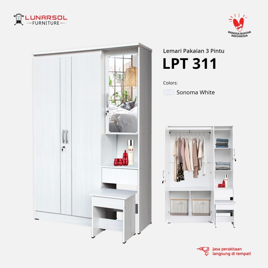 Lemari Pakaian Minimalis 3 pintu LPT 311 Full Putih Lunar Gratis Ongkir