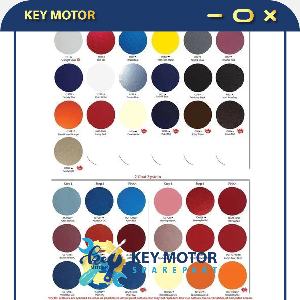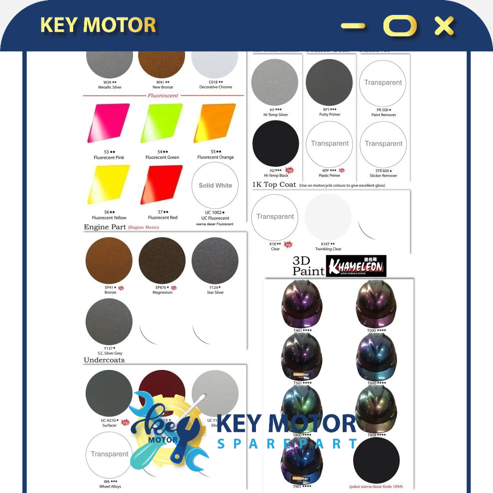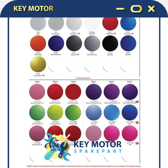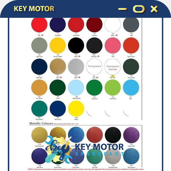 Black 109, Silver Metallic Y3, Red 6, Candy Yellow Y016, Brilliant Red Y138, Tivoli Blue 9, Signal Red 23, Super Violet 1142, White 102, Sparkling KUNING MENGKILAP 1123