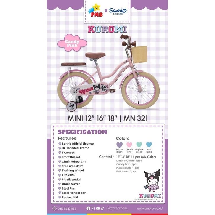 TERBARU SEPEDA ANAK PEREMPUAN PMB MORTEIN 321 KUROMI 12 16 18 INCH FREE RAKIT INSTAN BANDUNG