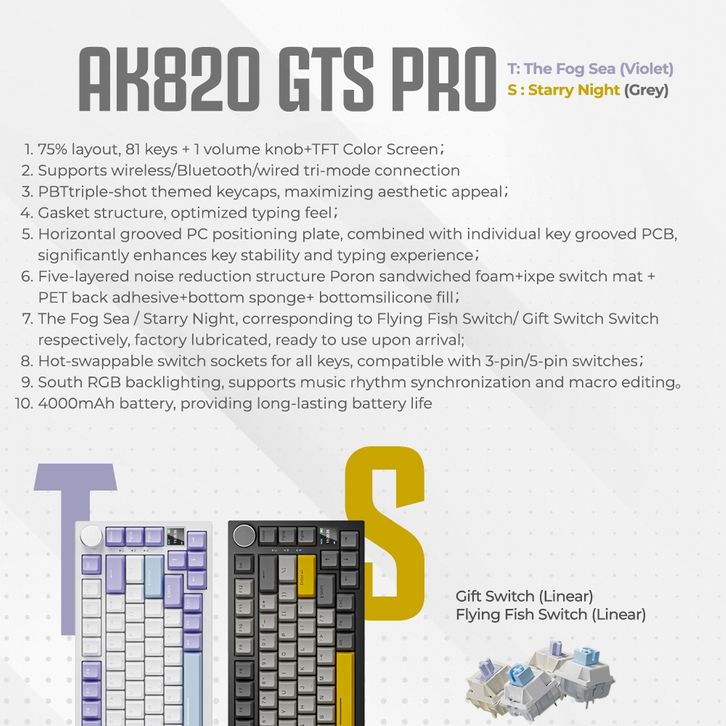 Ajazz AK820 GTS PRO 75 Keyboard Gaming Mechanical Wireless 3-M0De RGB Hotswappable 5 pin Gasket Mount with TFT LED