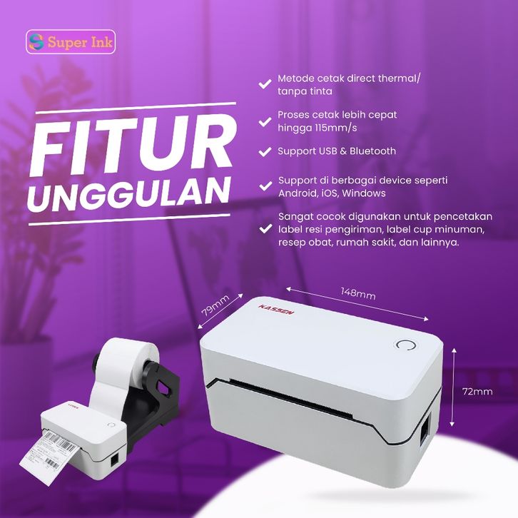 Printer Bluetooth KASSEN DT-369 Printer Label Thermal USB Bluetooth 80 mm cocok untuk 78x100mm