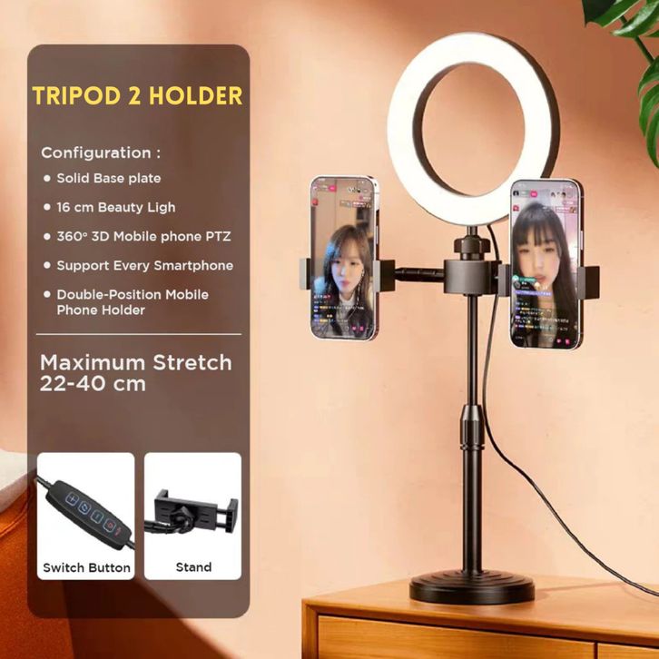 TriP00D 2 Holder dan Ringlight 16cm + TriP00D Mini Stand 28cm Hp Live Stream Make Up Vlog Lampu