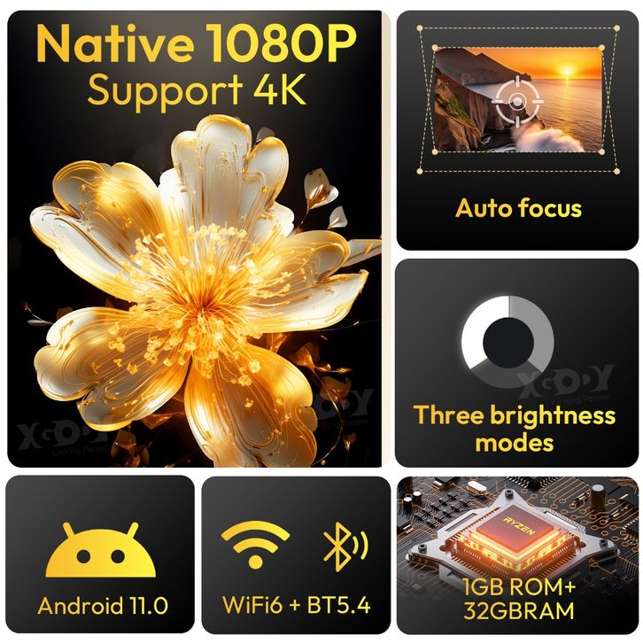 XGODY Gimbal A6 Pro Smart Proyektor LCD -Android11 - FHD 1080P - AUTO Focuse-Eye Protection-700 ANSI