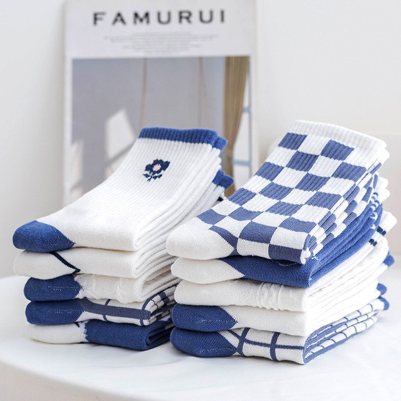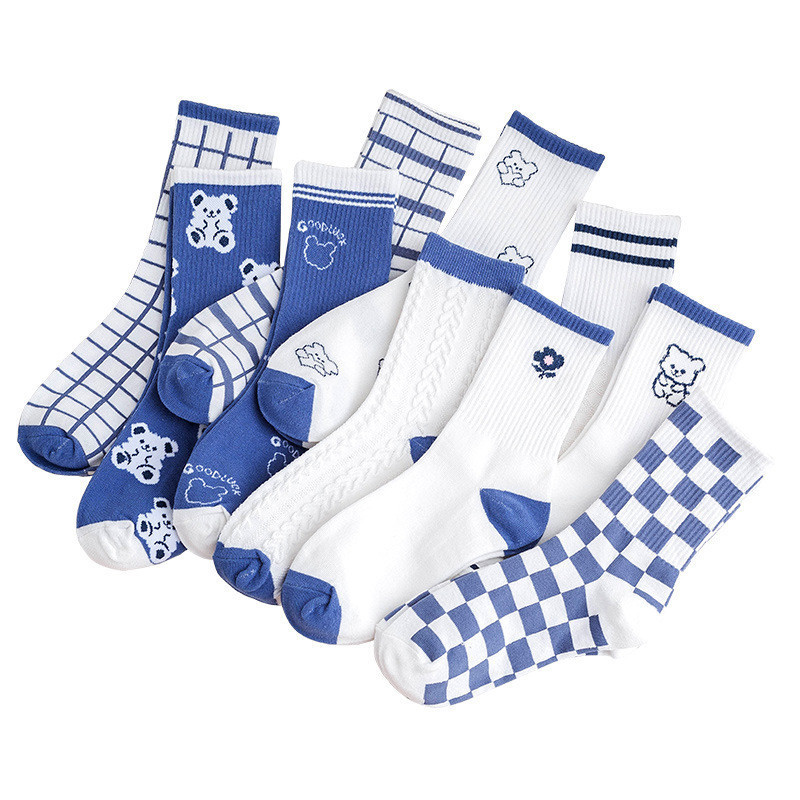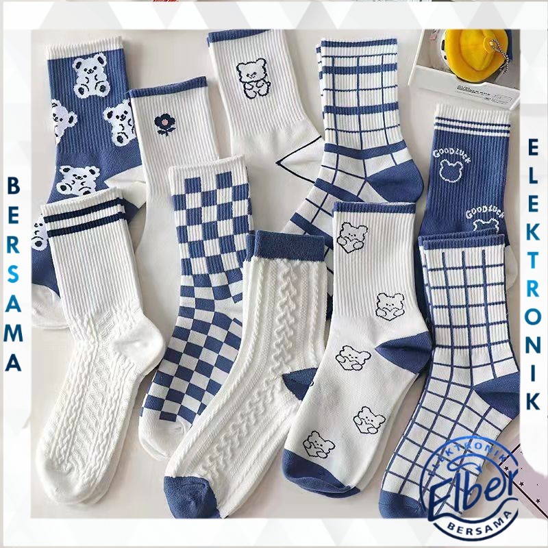 ELBER KS148 Kaos Kaki Panjang Motif Garis Putih Biru Kaus Kaki Olahraga Atas Mata Kaki Unisex Kekinian Y1806