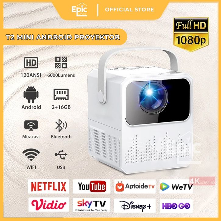T2mini Proyektor Android TV 1080P Smart Projector 6000 Lumen Android 9.0 Ram 2G Rom 16G proyektor mini portable hp Home