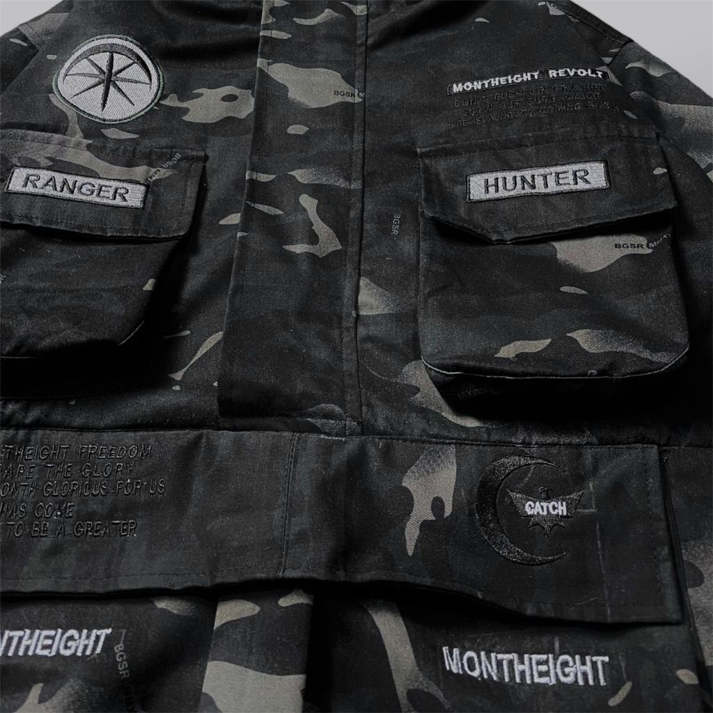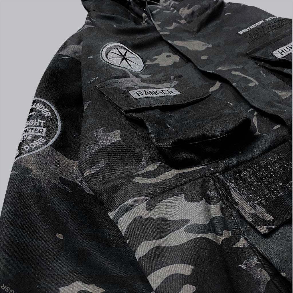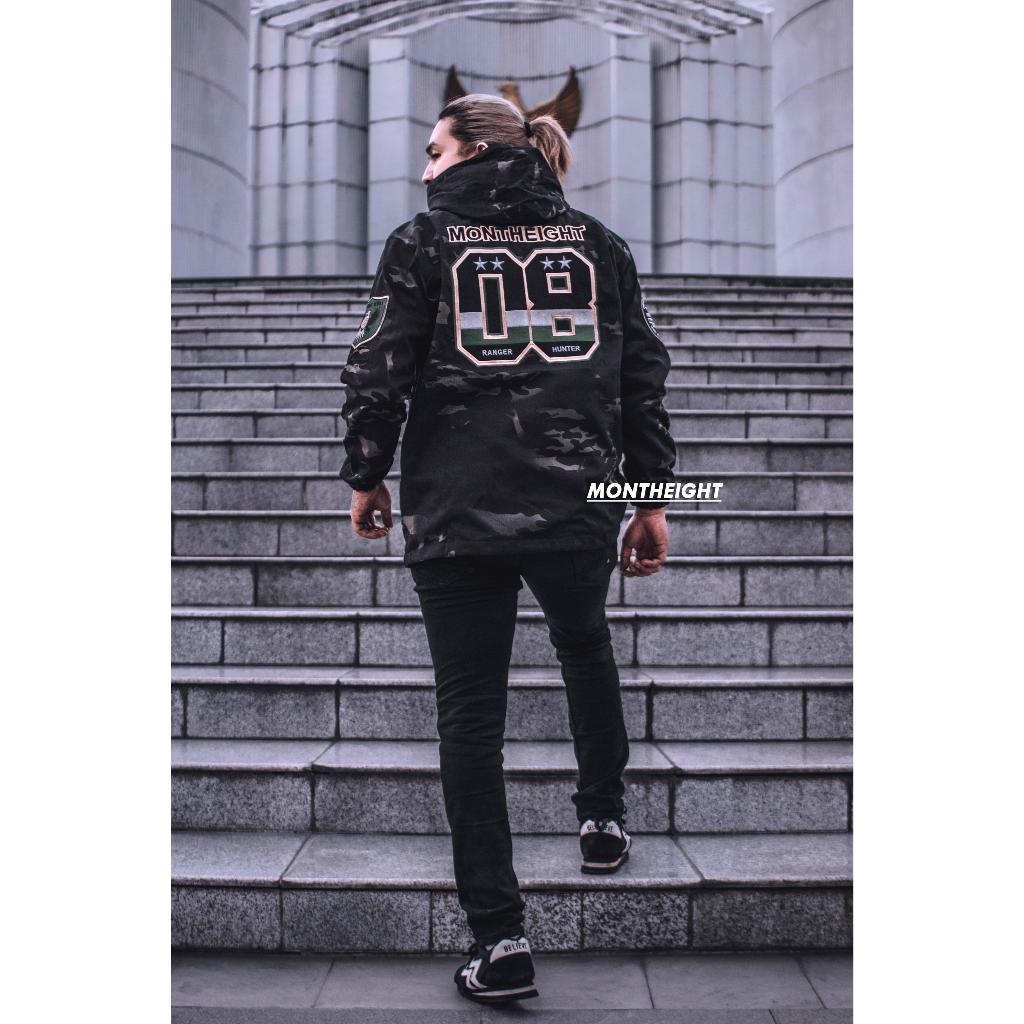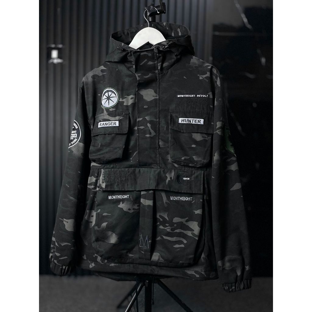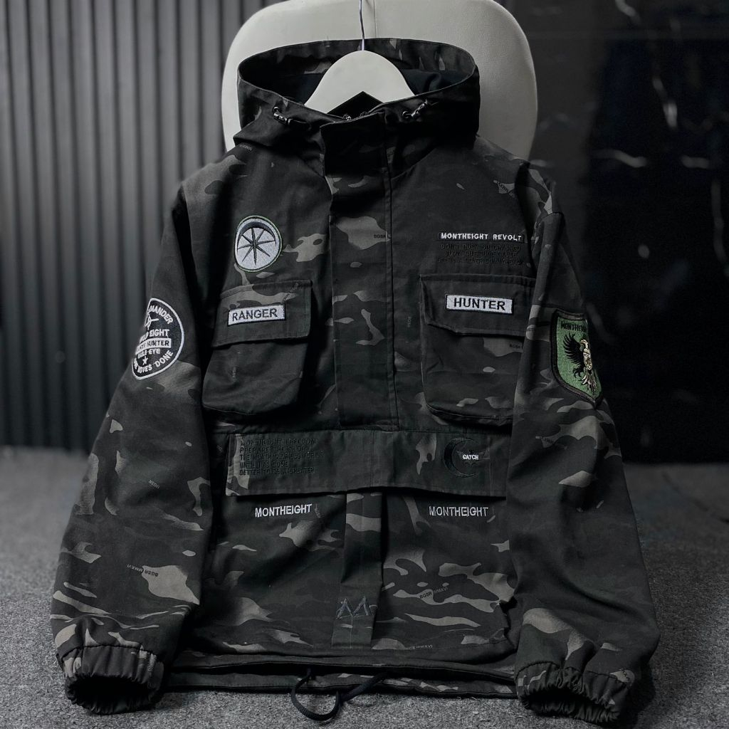 Jaket Cagoule pria army PREMIUM pocket TERBARU JACKET SEMY PARKA LORENG BAHAN KANVAS TEBAL CORAK CAMO BLACK distro monteight