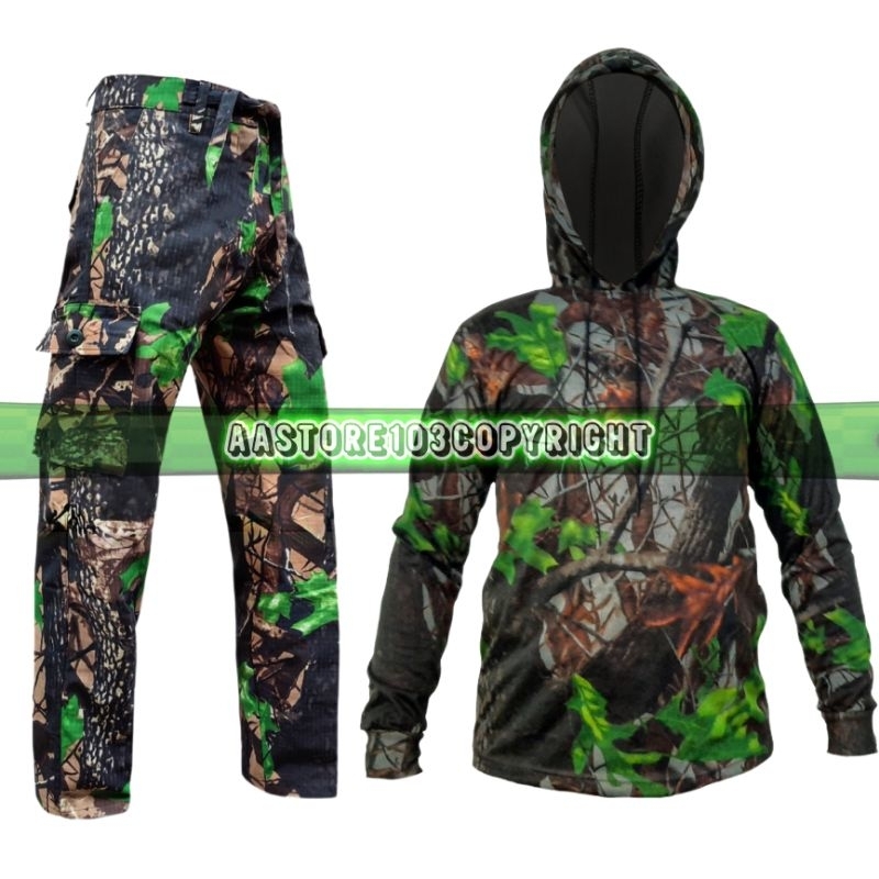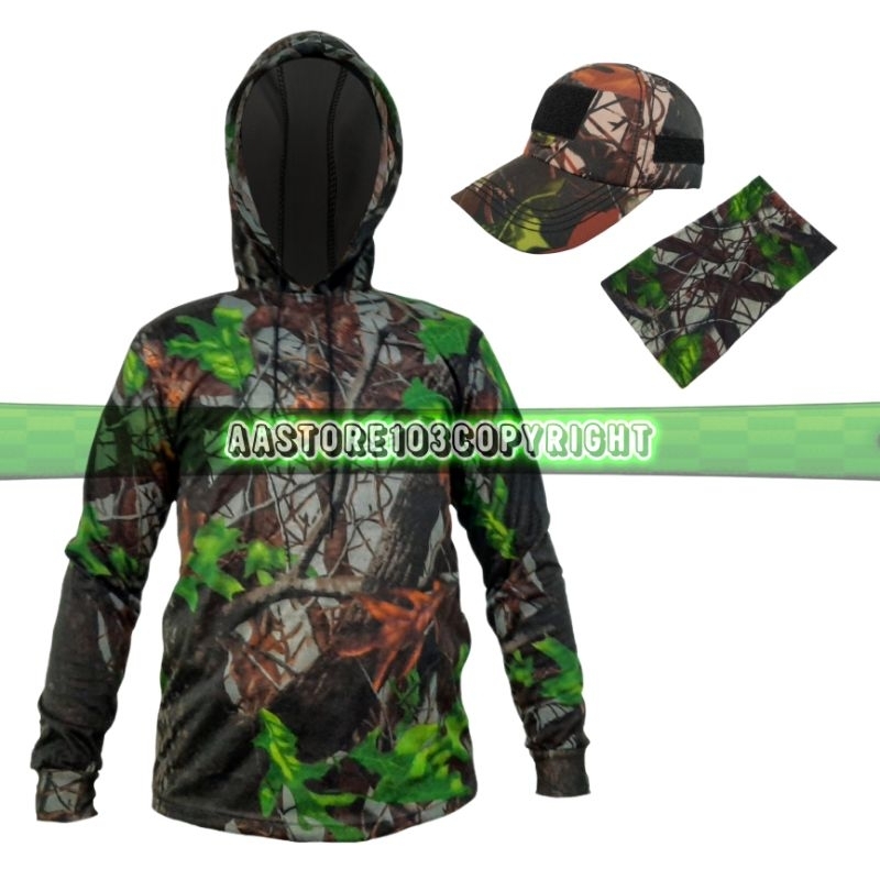 SATU SET SETELAN KAOS HOODIE TOPI BUFF LORENG CAMO PERBAKIN - BAJU LORENG CAMO HUNTING