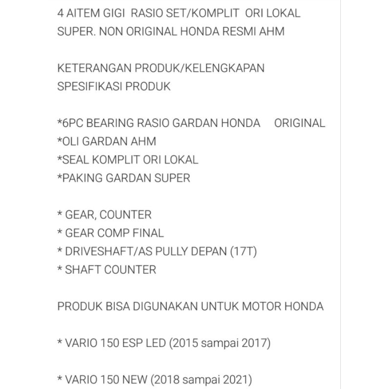 Paket Komplit Rasio Gear BOX Gardan 4aitem K59+6PC Bearing+Oli+Sil Komplit+Paking Vario 150 Esp Led (2015-2017 Vario 15