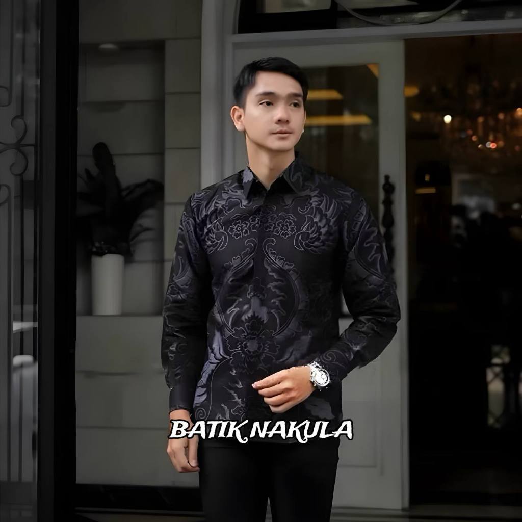 Batik Pria Lengan Panjang BATIK NAKULA HRB026 motif KERATONAN Kode MAHKOTA HITAM