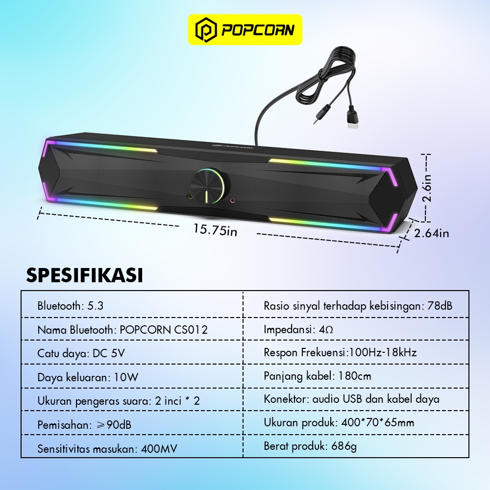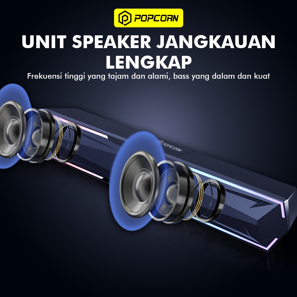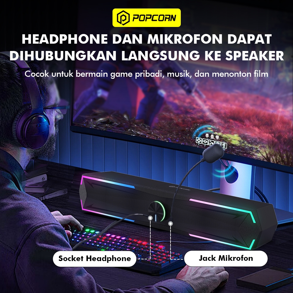 Popcorn CS012 Soundbar RGB LED Surround Gaming Speaker Bluetooth 5.3 USB 3.5mm Audio with Mic