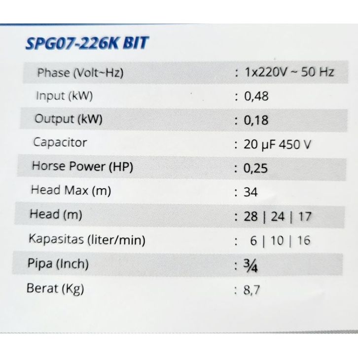 Murah POMPA AIR SATELIT SHIMIZU SPG07-238 BIT 0.5 HP + KABEL /POMPA SUBMERSIBLE 1/2 HP 2 INCH / SPG07=226K BIT / SPG07=