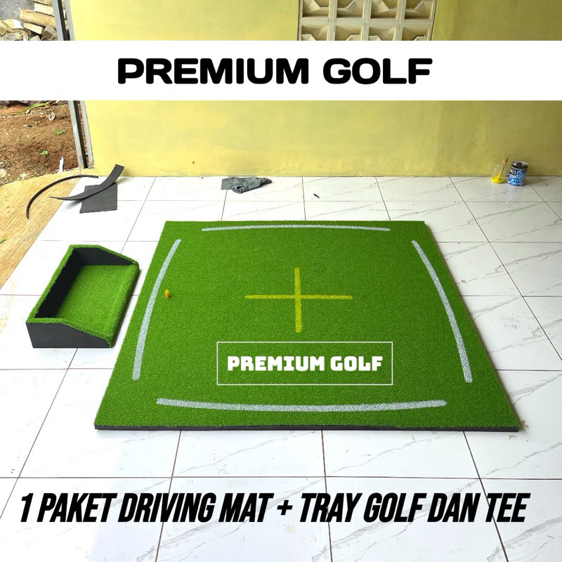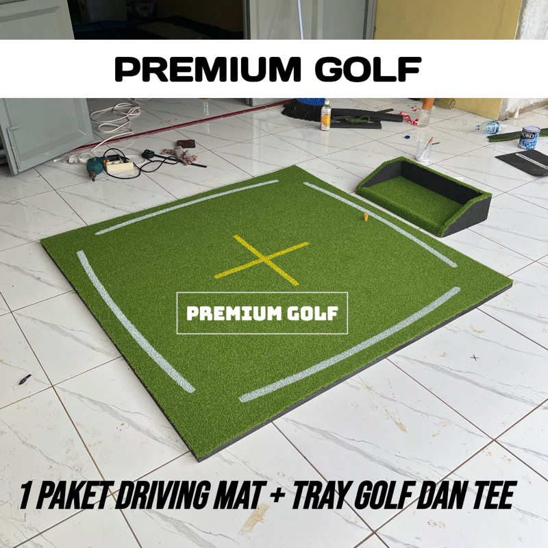 karpet Driving golf mat halipad + tray golf ukuran 120x120 cm garis kuning