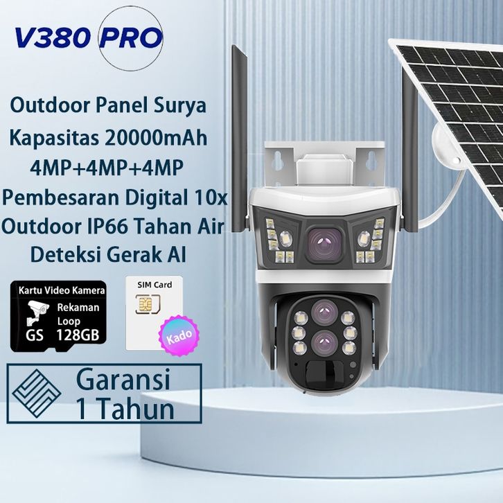 V380 Pro Zoom 10X Sejati Kamera CCTV Tenaga Surya Kapasitas Baterai 20000mAh 4G SIM Tiga Lensa CCTV