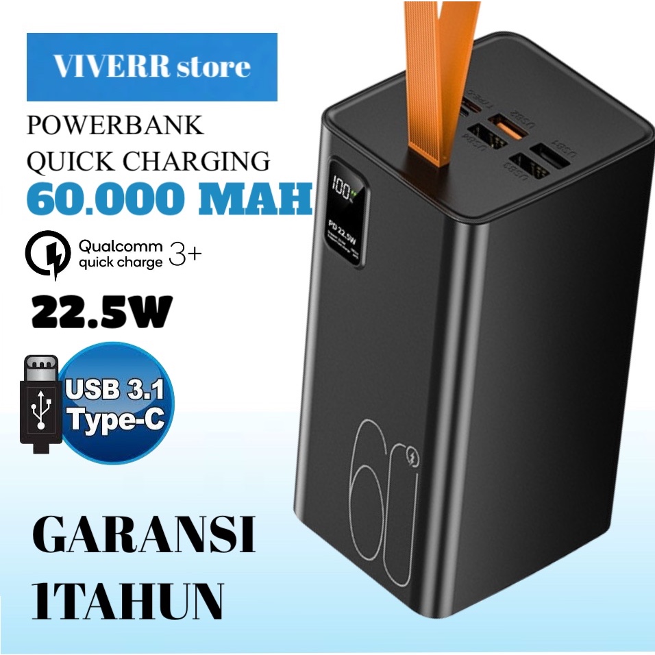 Powerbank VIVERR R19 kapasitas 60.000 mAh Garansi 1 Tahun.