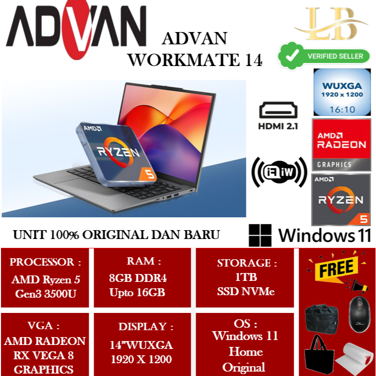 Laptop Gaming Murah ADVAN Workmate 14 Amd Ryzen 5 32GB 1TB SSD 14"WUXGA Win11Home