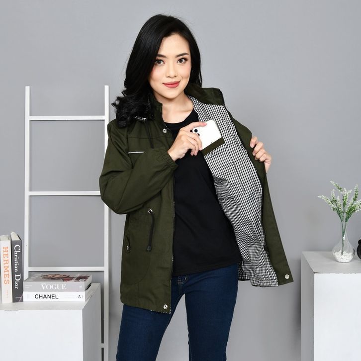 PREMIUM Jaket Parka Kanvas Wanita Bolak Balik Korean Style Waterproof Hoodie Bisa Dilepas idafmn