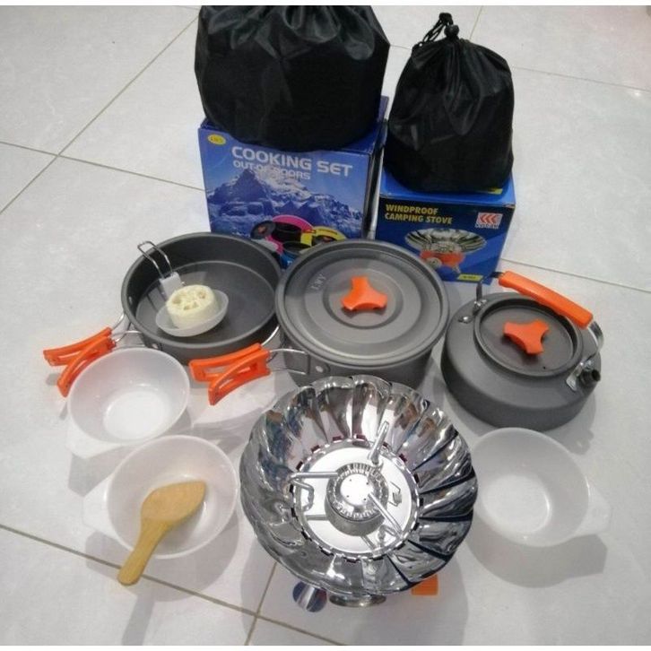 Paket Hemat Alat Masak Camping Cooking Set DS 308 Plus Teko Dan Kompor Windproof Anti Angin Model Bunga Nesting Gunung O