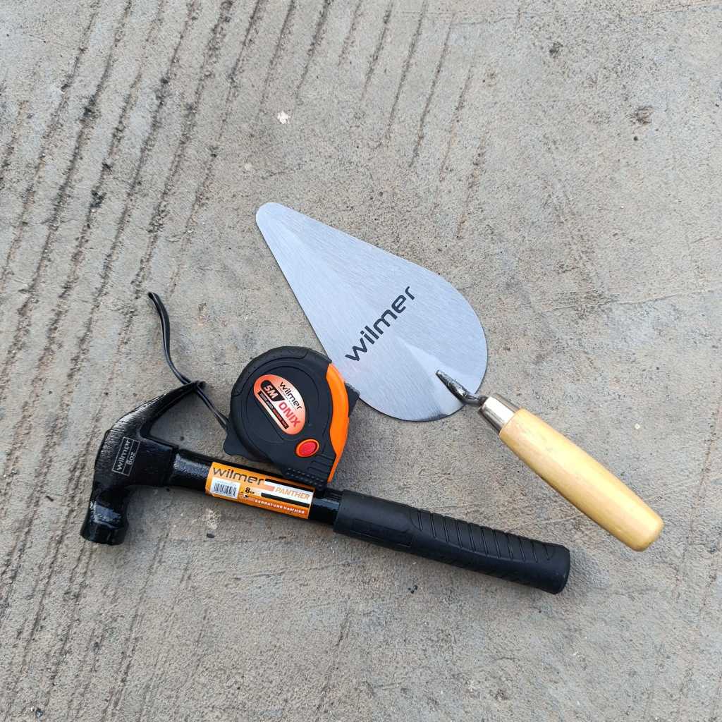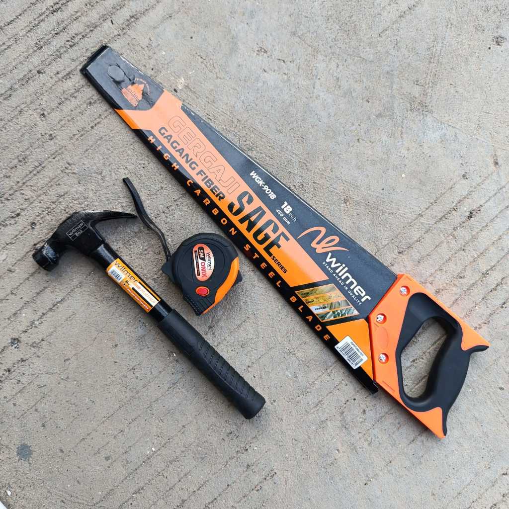 PAKET TUKANG SIAP PAKAI -Gergaji kayu baja asli 18inc gagang fiber - Palu kambing - Sendok semen - Meteran viper