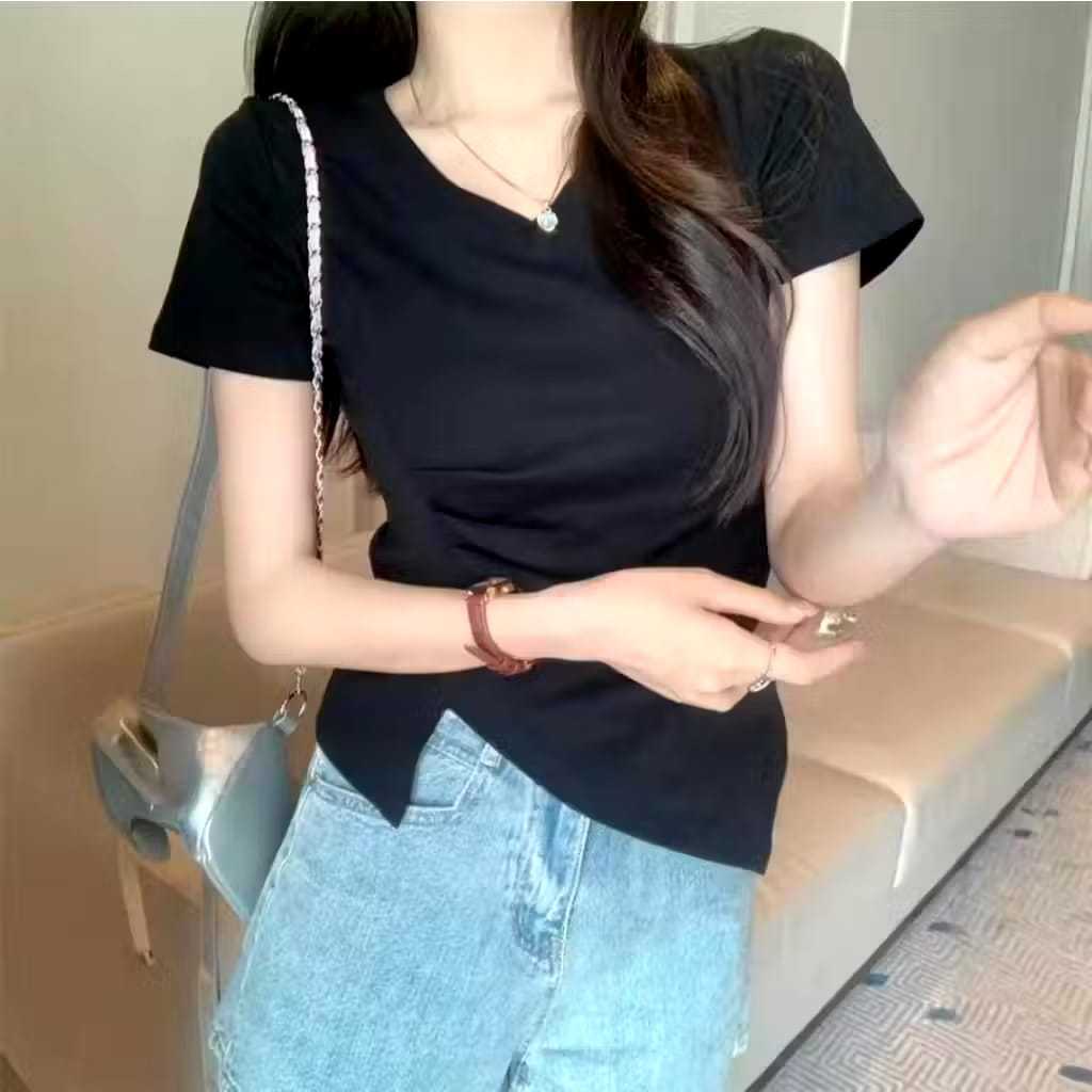 Lisz Fashion / Atasan V-Neck Lengan Pendek Lipatan Slit Asimetris Samping / Kaos Atasan Wanita korean Kekinian Unik 6065