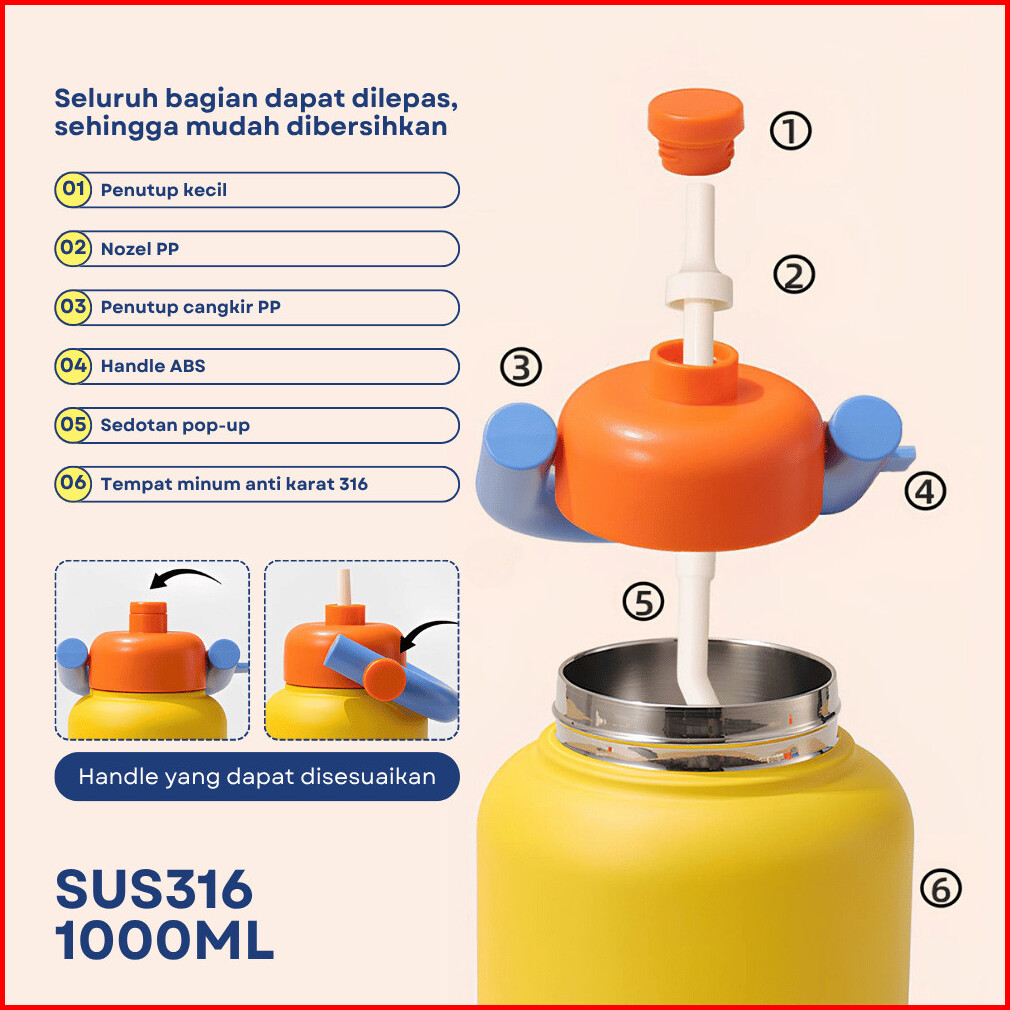 Funkoo Botol Minum Anak Stainless 1000ml Vacuum Thermos Stainless Steel 316 Tumbler Lucu 4 Warna