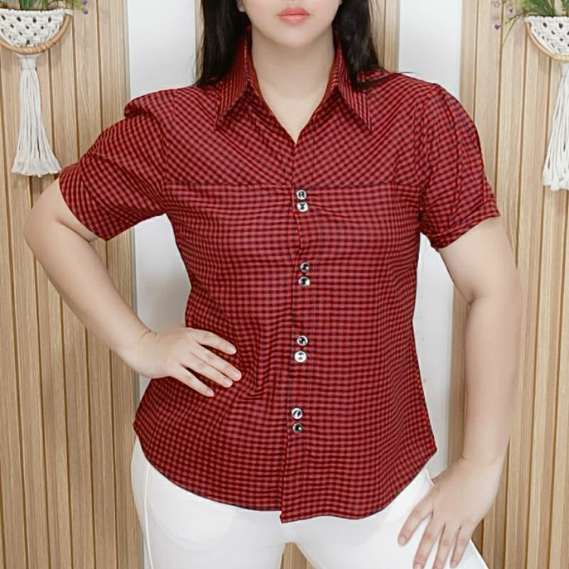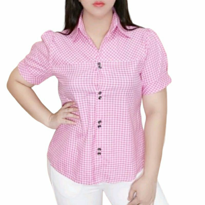 Kemeja Jumbo Motif Kotak Catur Kasual Wanita Bahan Katun Kotak Lengan Pendek Kerah Kemeja