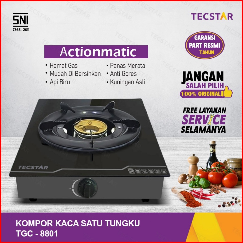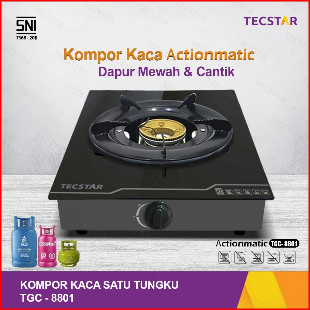 Tecstar Kompor Kaca Tempered Tgc-8801 Satu Tungku Actionmatic Sni Burner Kuat Anti-slip Hemat