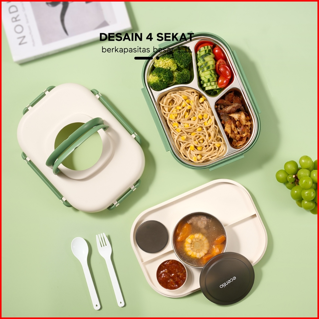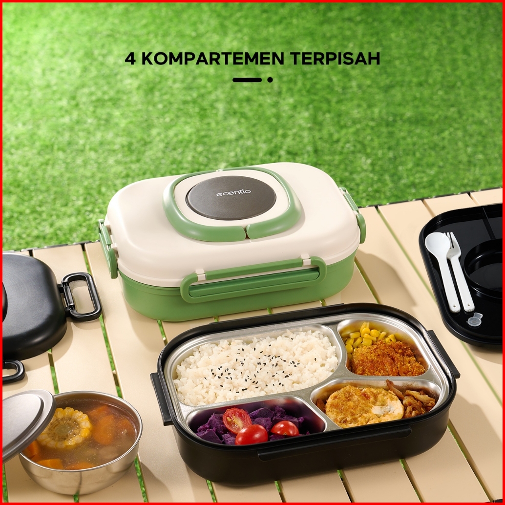 Ecentio 4 Sekat Kotak Makan Set 1100ml Anti Tumpah Lunch Box Set Stainless Sendok Free Tempat Sup