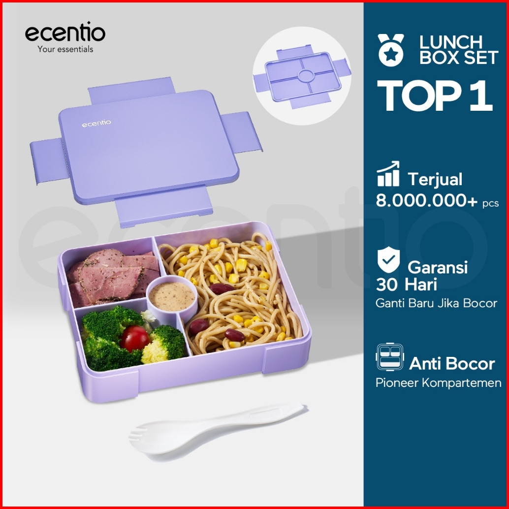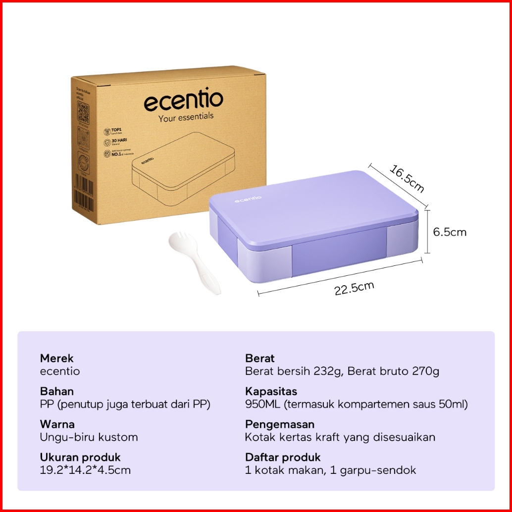 Ecentio Kotak Makan Plastik Lunch Box 3 Kompartemen Perlindungan Anti Bocor Desain Isolasi Tertutup Warna Ungu-biru 950m