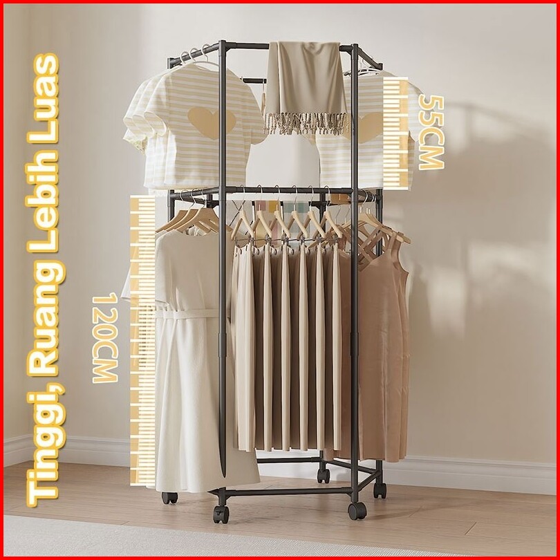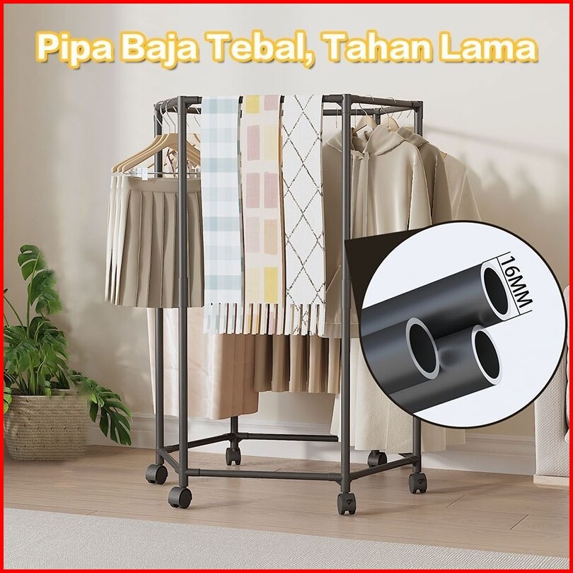 Paus Biru - Rak Gantungan Baju Dapat Berputar 360 Hanger Pakaian Serbaguna Tanpa Bor Anti Karat Dengan Roda